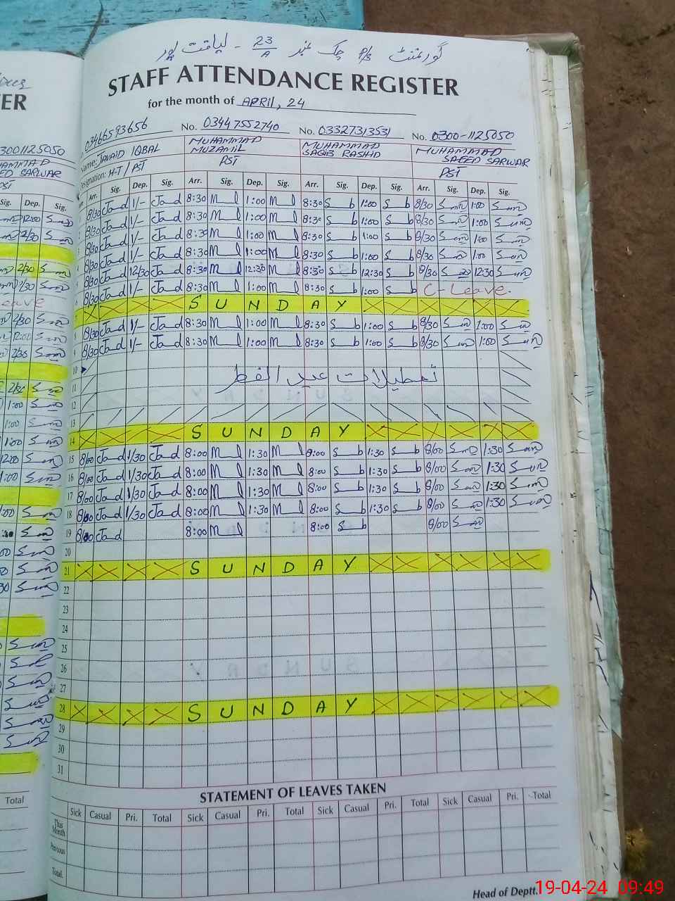 | CNIC | Full Name | Designation | R/C | Absence During Last Calender Month |