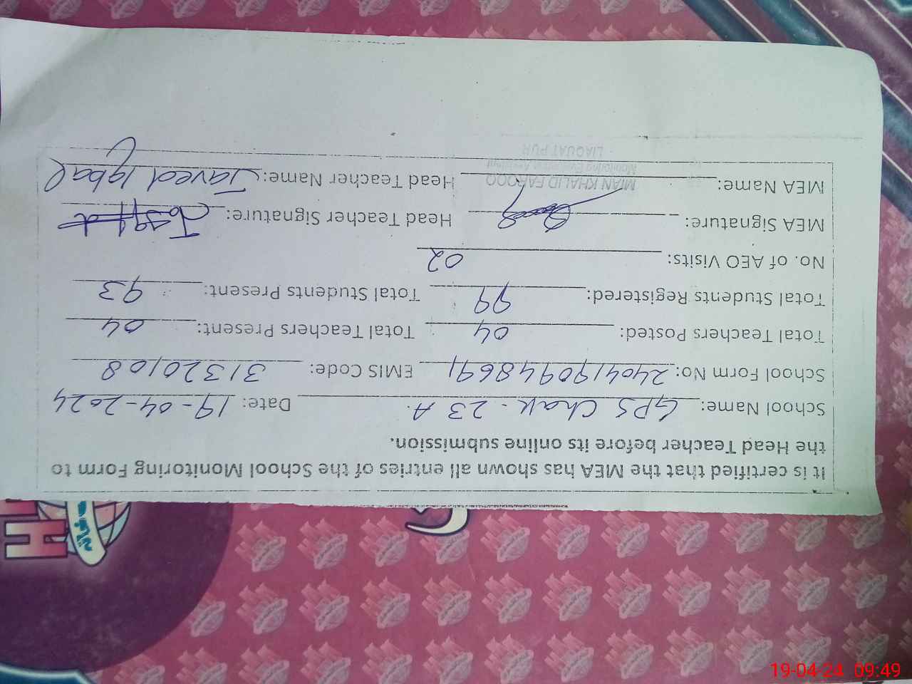 | Certified that this School was Inspected by the Undersigned MEA/DMO Today and the Information Stated Above is as Per Record. | |||||