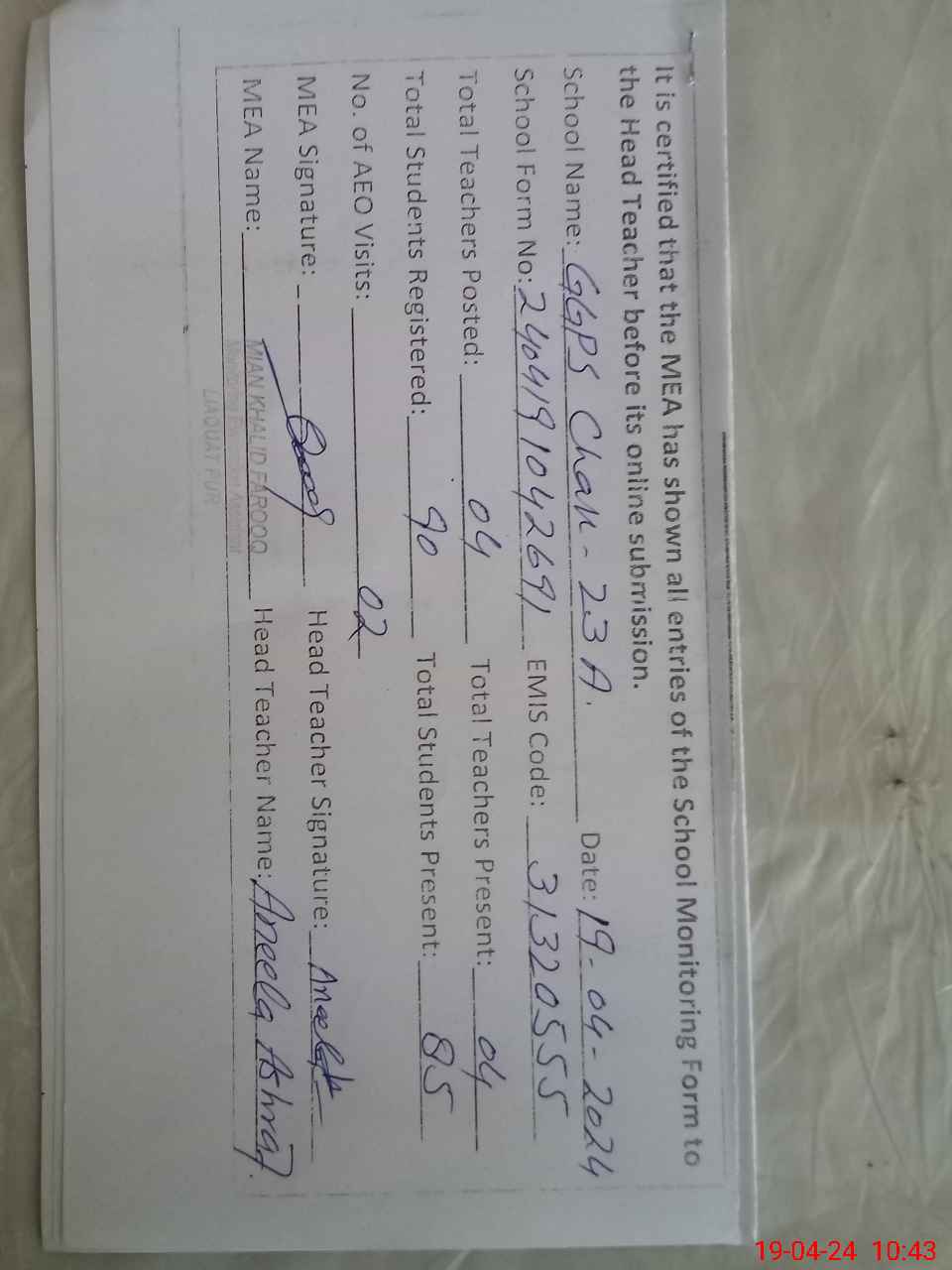 | Name: An**** As**** Designation: (School Headmaster's/Headmistress's) PST Phone/Cell Number: 03**** |