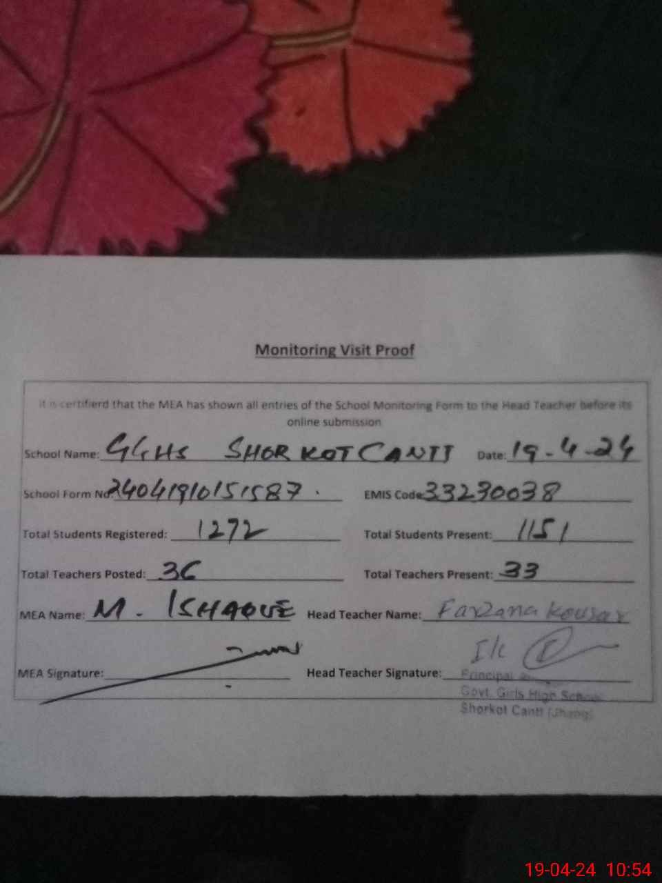 | EMIS Code: 33230038 | Name of School: GGHS SHORKOT CANTT | |||