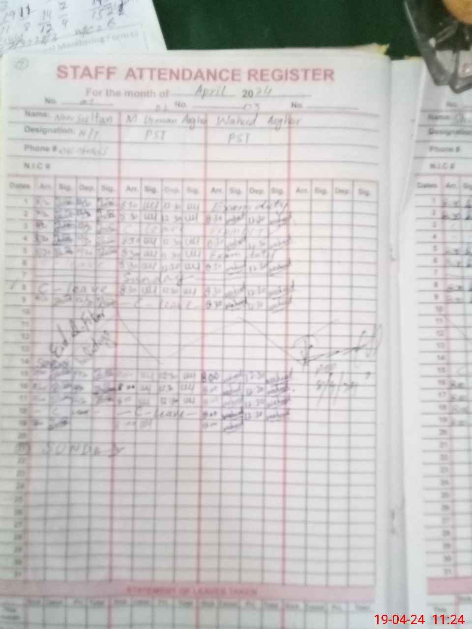 | CNIC | Full Name | Designation | R/C | Absence During Last Calender Month |