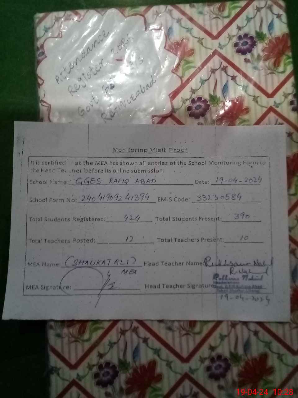 | Attendance Register | Head Teacher | MEA with School | Visit Proof |