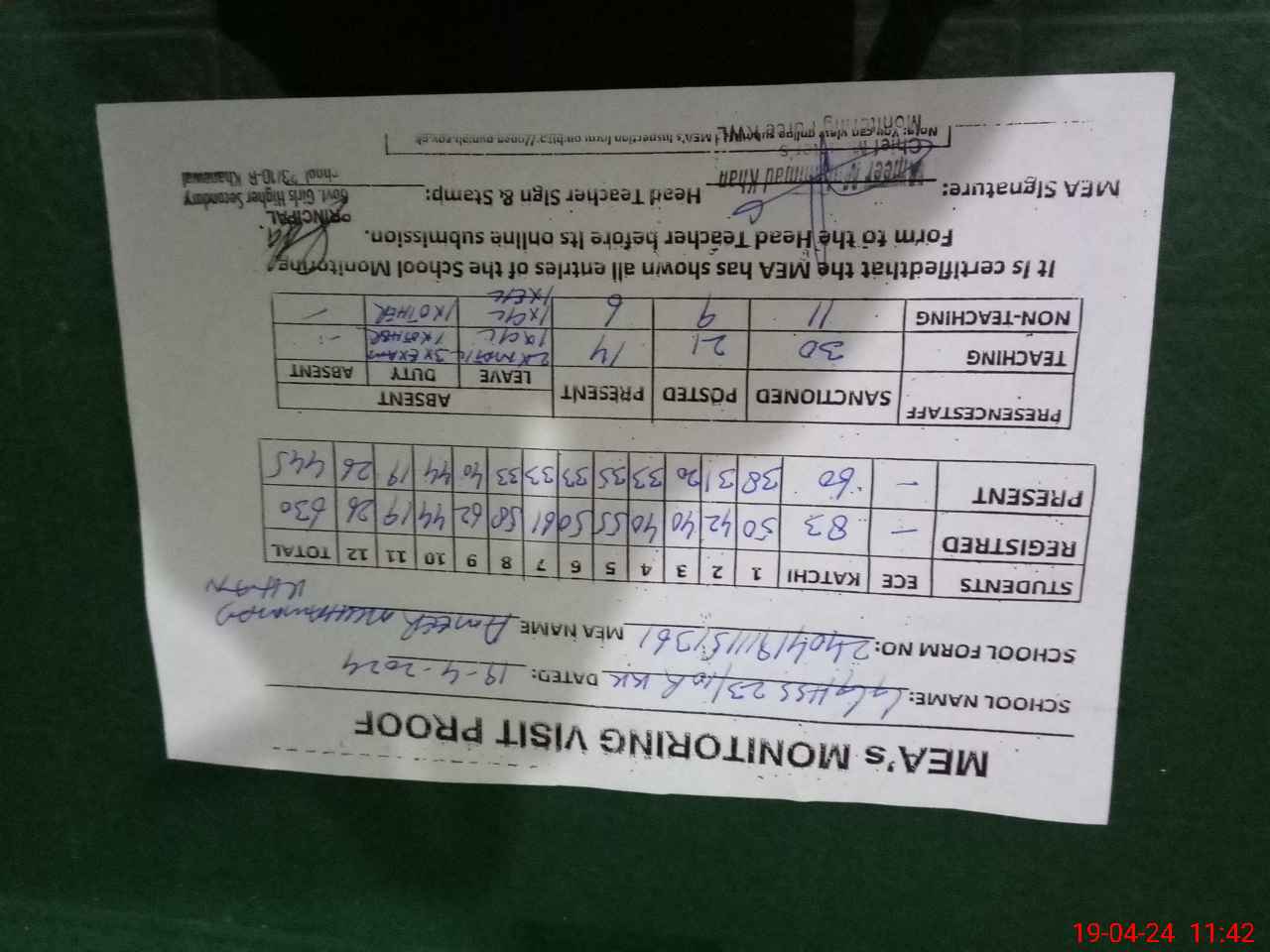 | Attendance Register | Head Teacher | MEA with School | Visit Proof |
