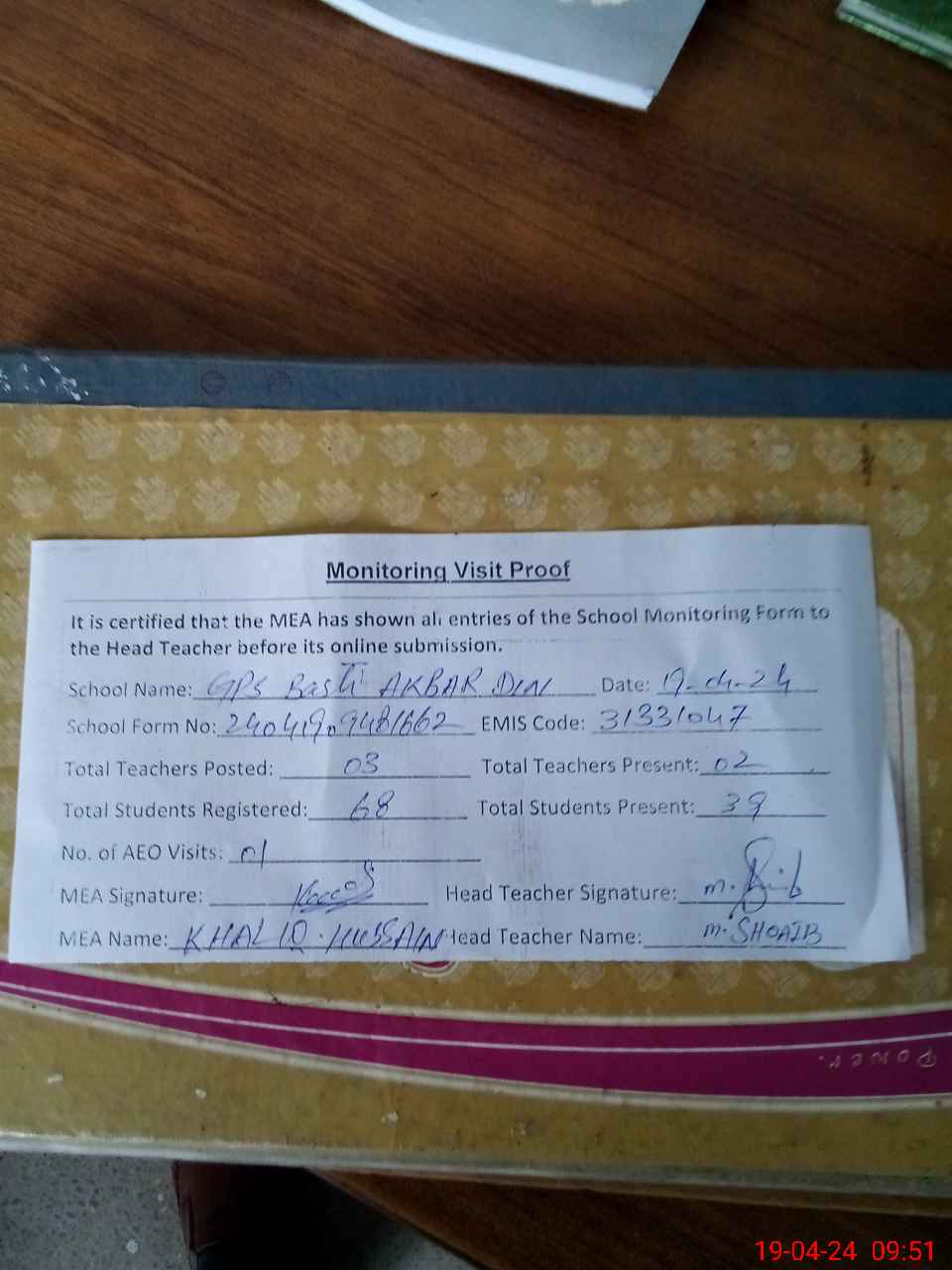 | Attendance Register | Head Teacher | MEA with School | Visit Proof |