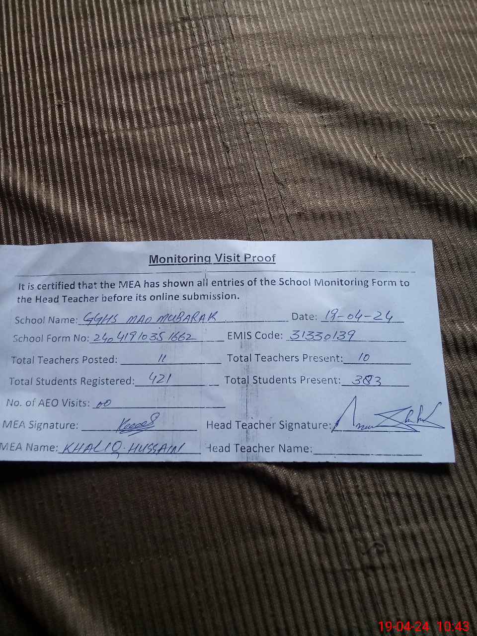 | Certified that this School was Inspected by the Undersigned MEA/DMO Today and the Information Stated Above is as Per Record. | |||||