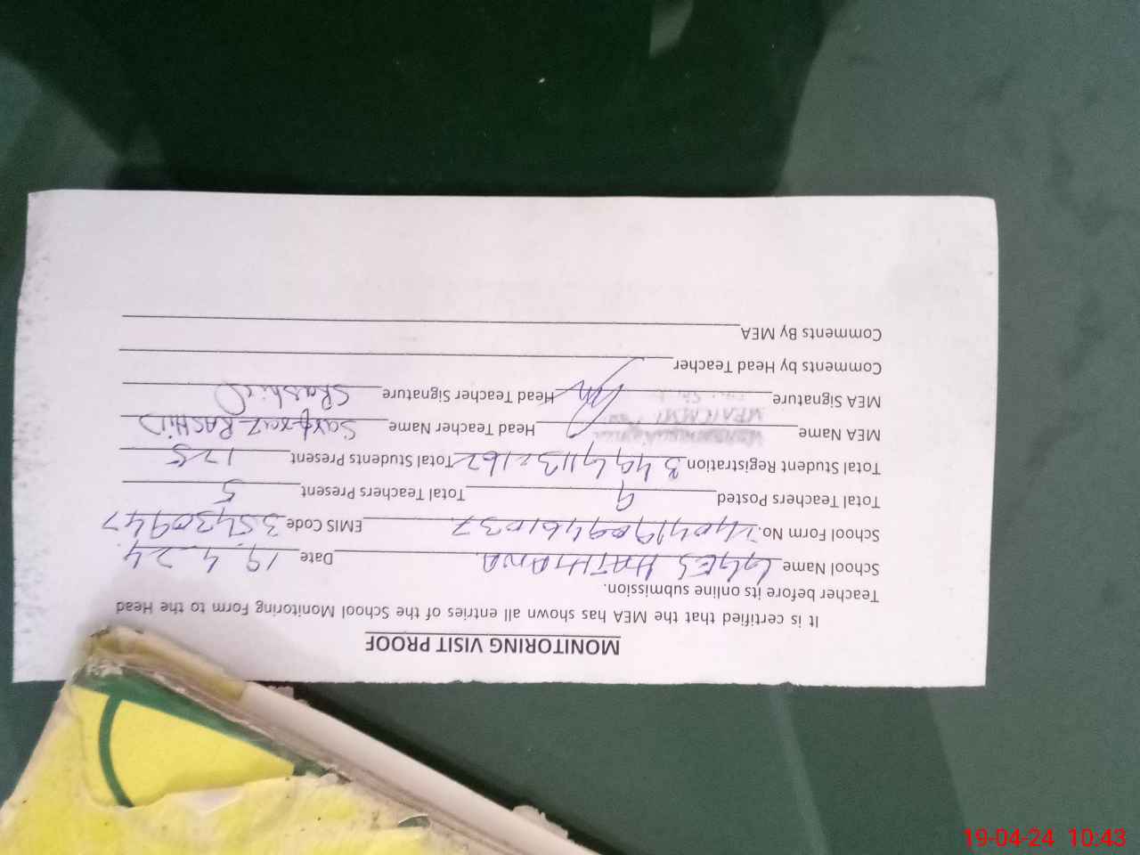 | Attendance Register | Head Teacher | MEA with School | Visit Proof |
