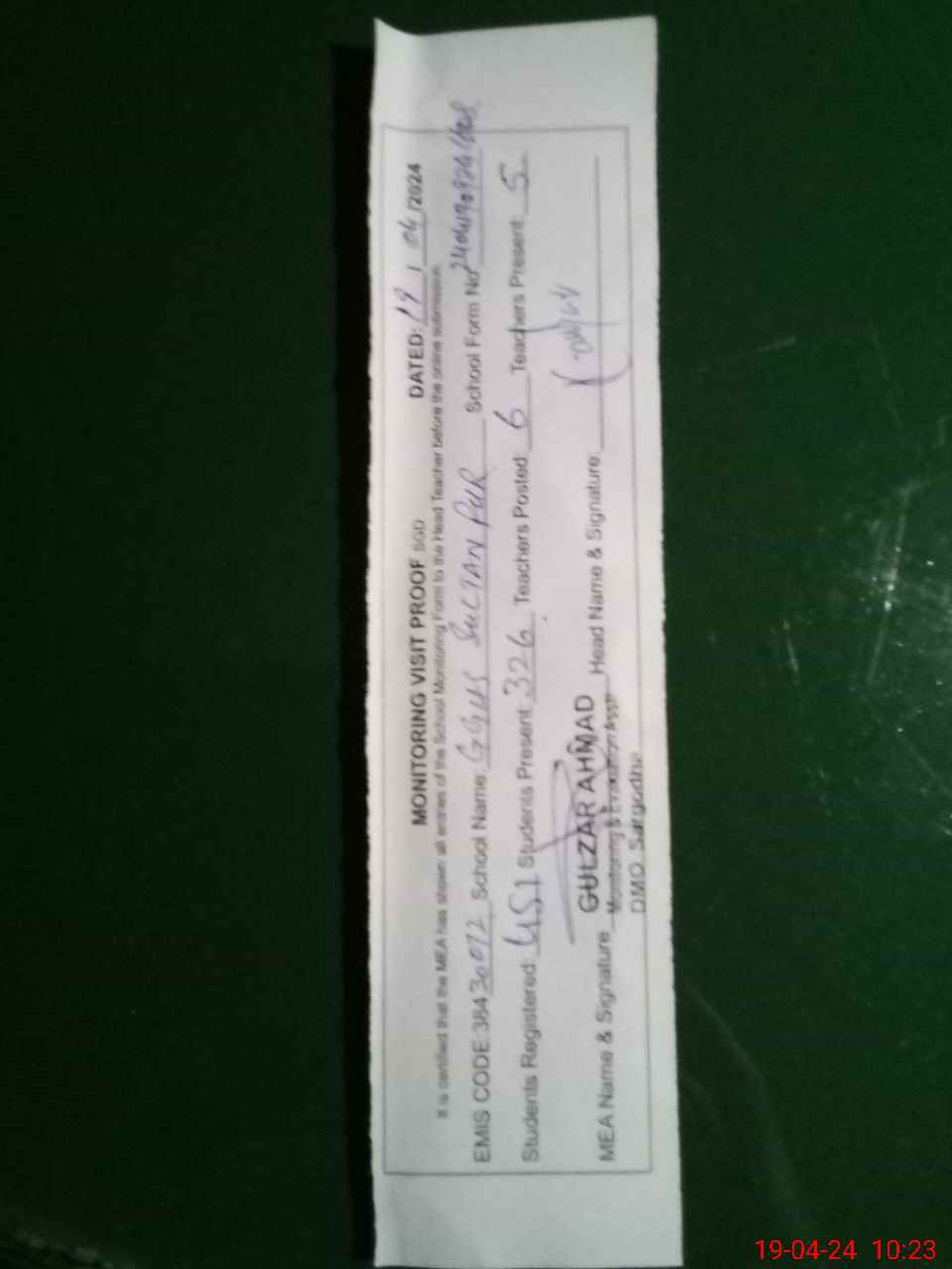 | Attendance Register | Head Teacher | MEA with School | Visit Proof |