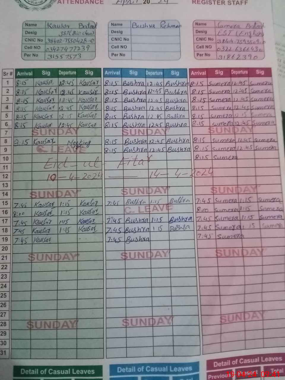 | CNIC | Full Name | Designation | R/C | Absence During Last Calender Month |