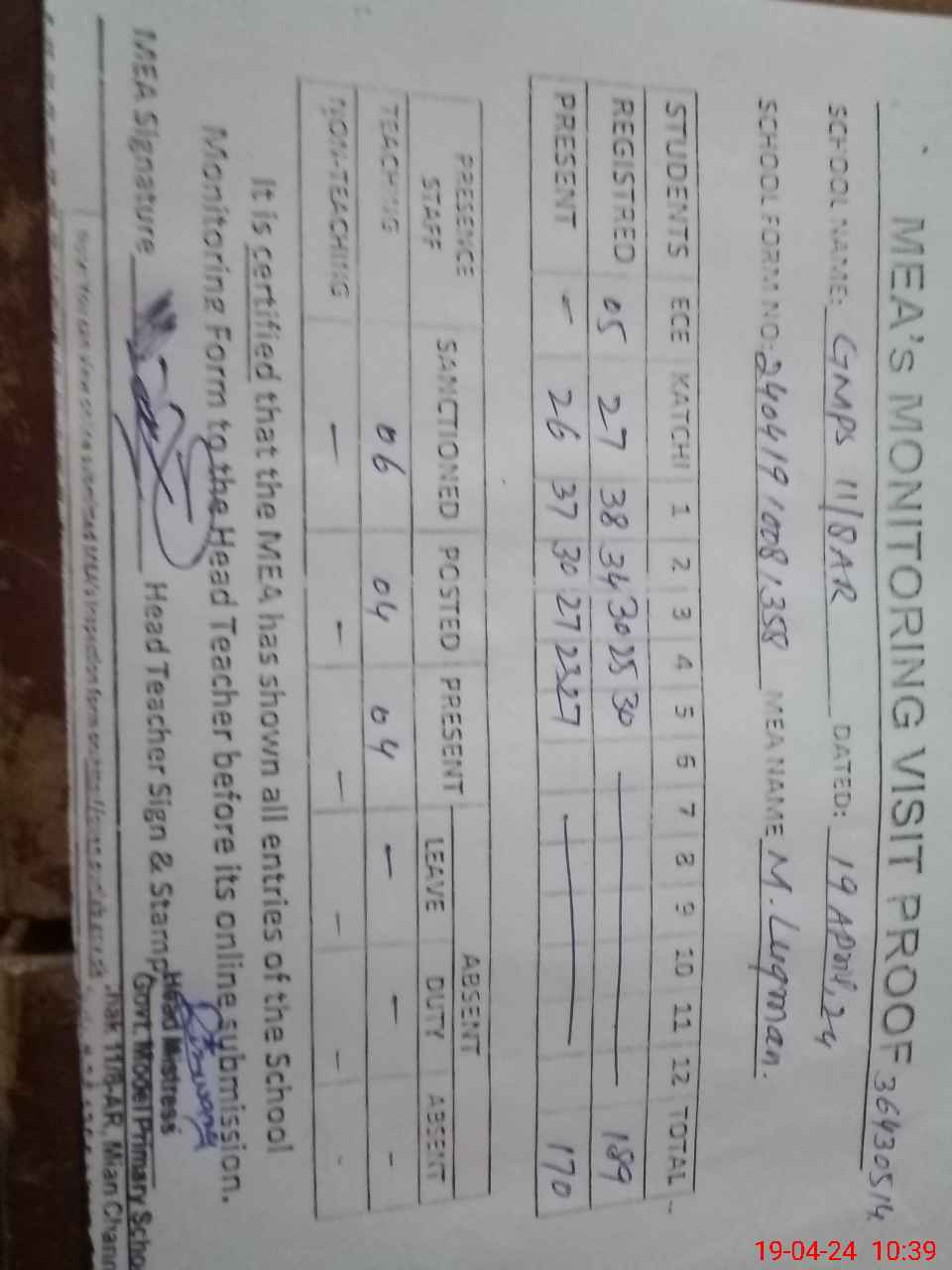 | Certified that this School was Inspected by the Undersigned MEA/DMO Today and the Information Stated Above is as Per Record. | |||||