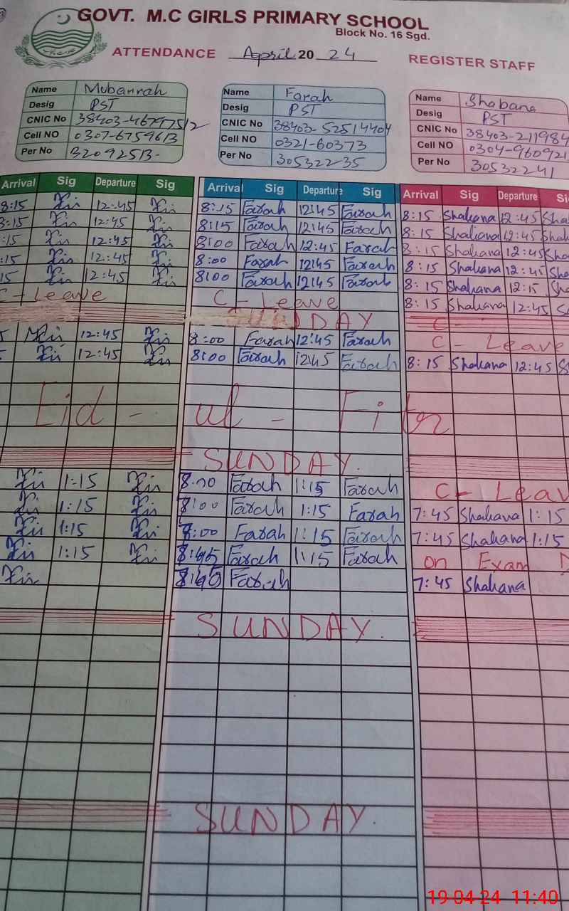 | CNIC | Full Name | Designation | R/C | Absence During Last Calender Month |