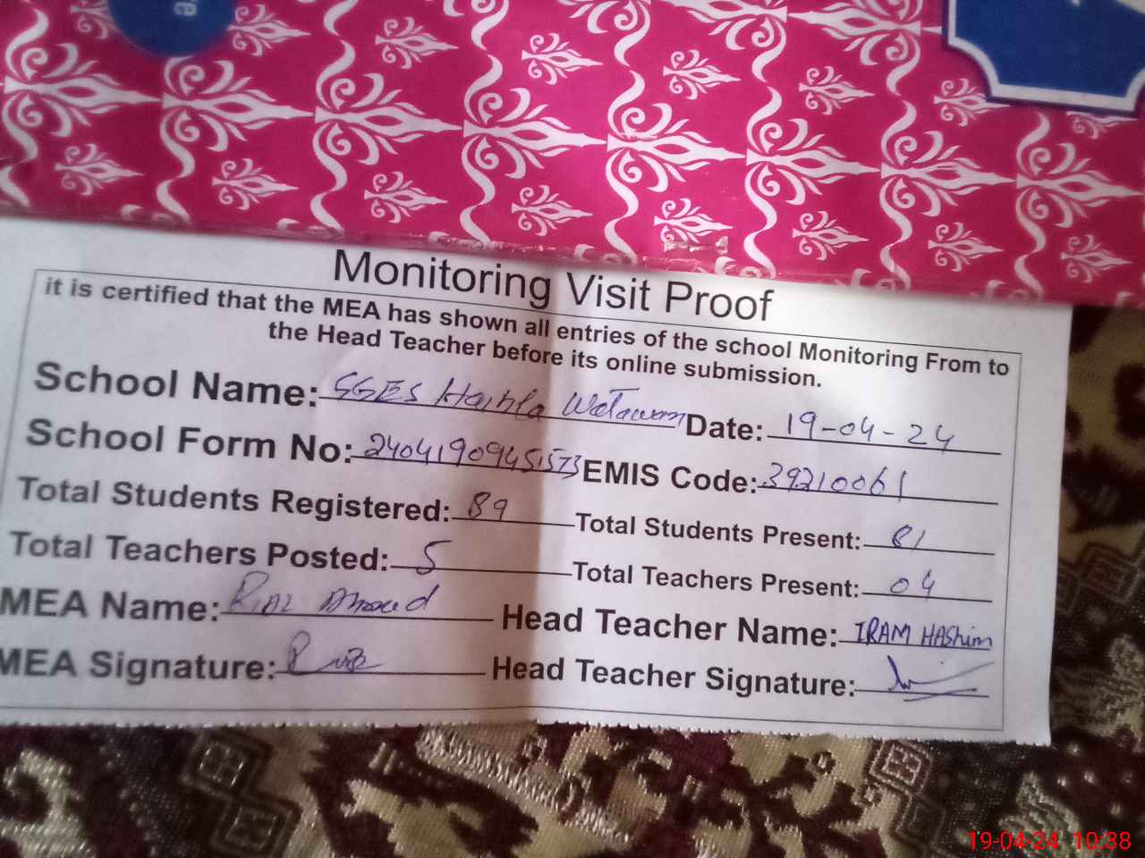 | Certified that this School was Inspected by the Undersigned MEA/DMO Today and the Information Stated Above is as Per Record. | |||||