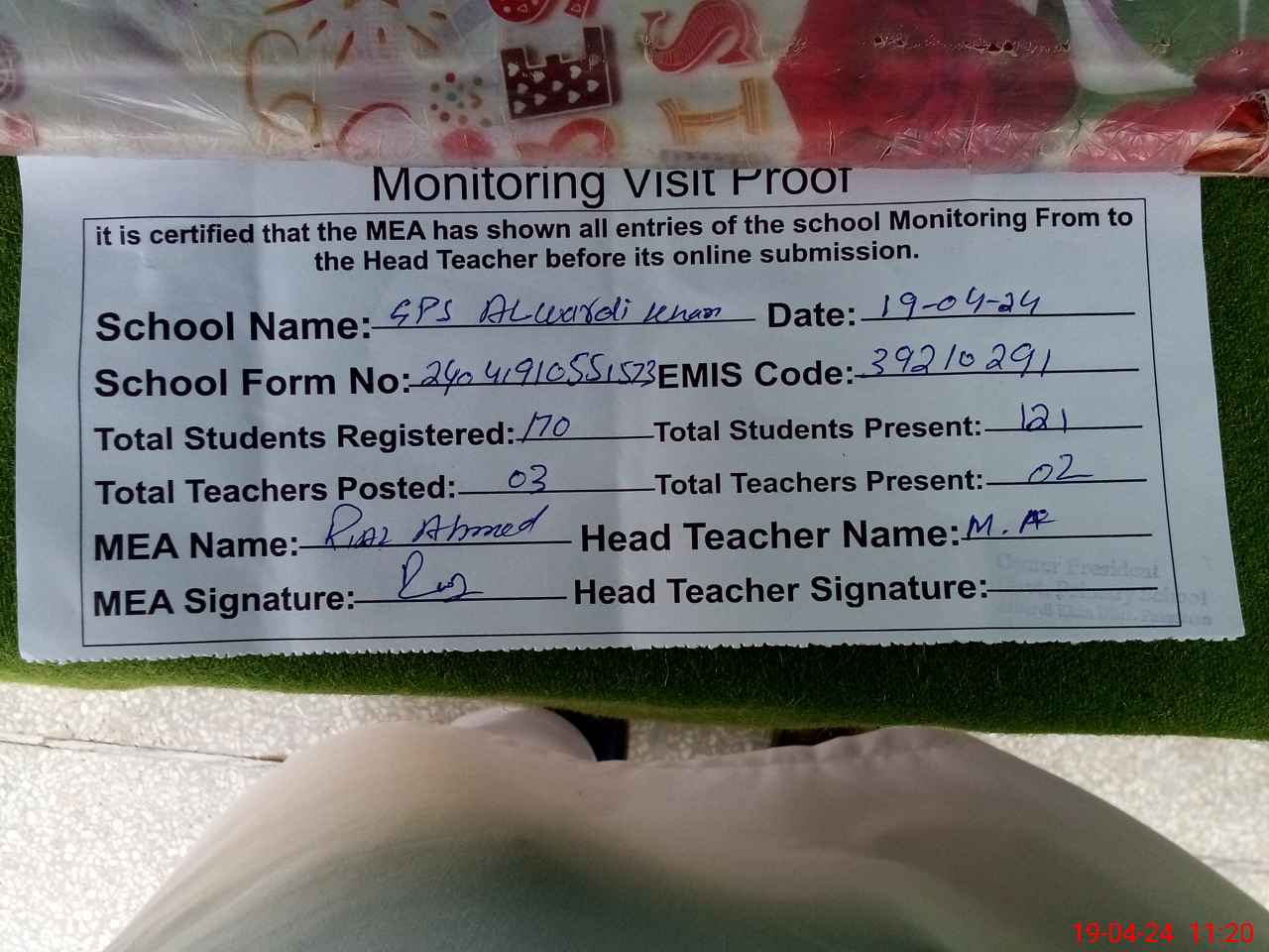 | EMIS Code: 39210291 | Name of School: GPS ALWARDI KHAN | |||