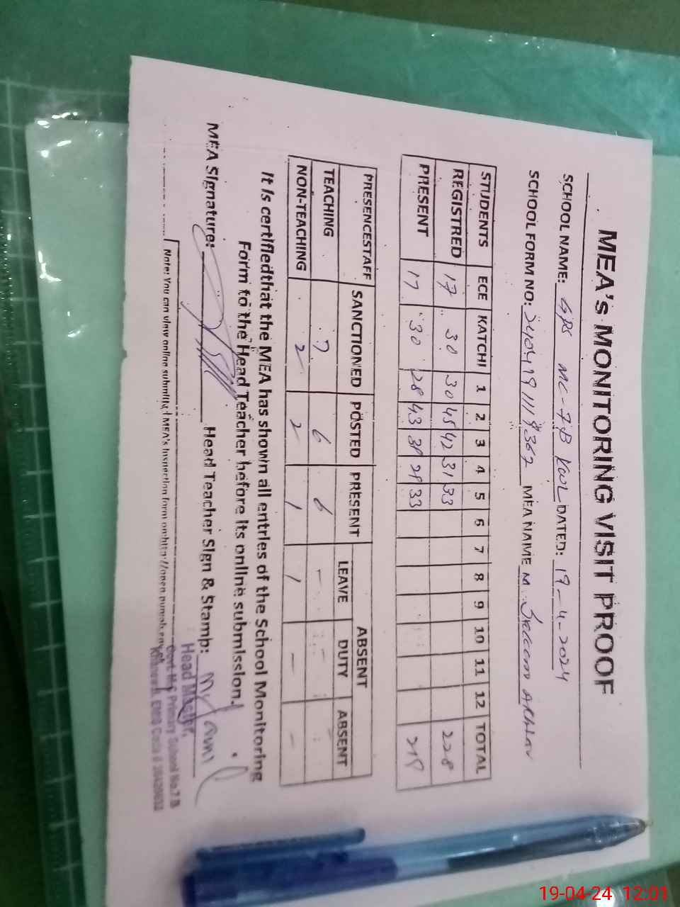 | Attendance Register | Head Teacher | MEA with School | Visit Proof |