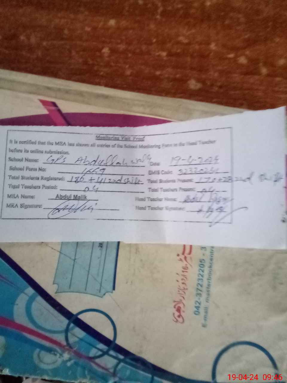 | Attendance Register | Head Teacher | MEA with School | Visit Proof |