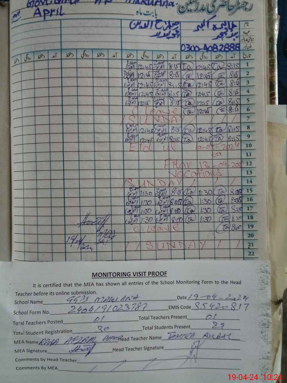 | Attendance Register | Head Teacher | MEA with School | Visit Proof |