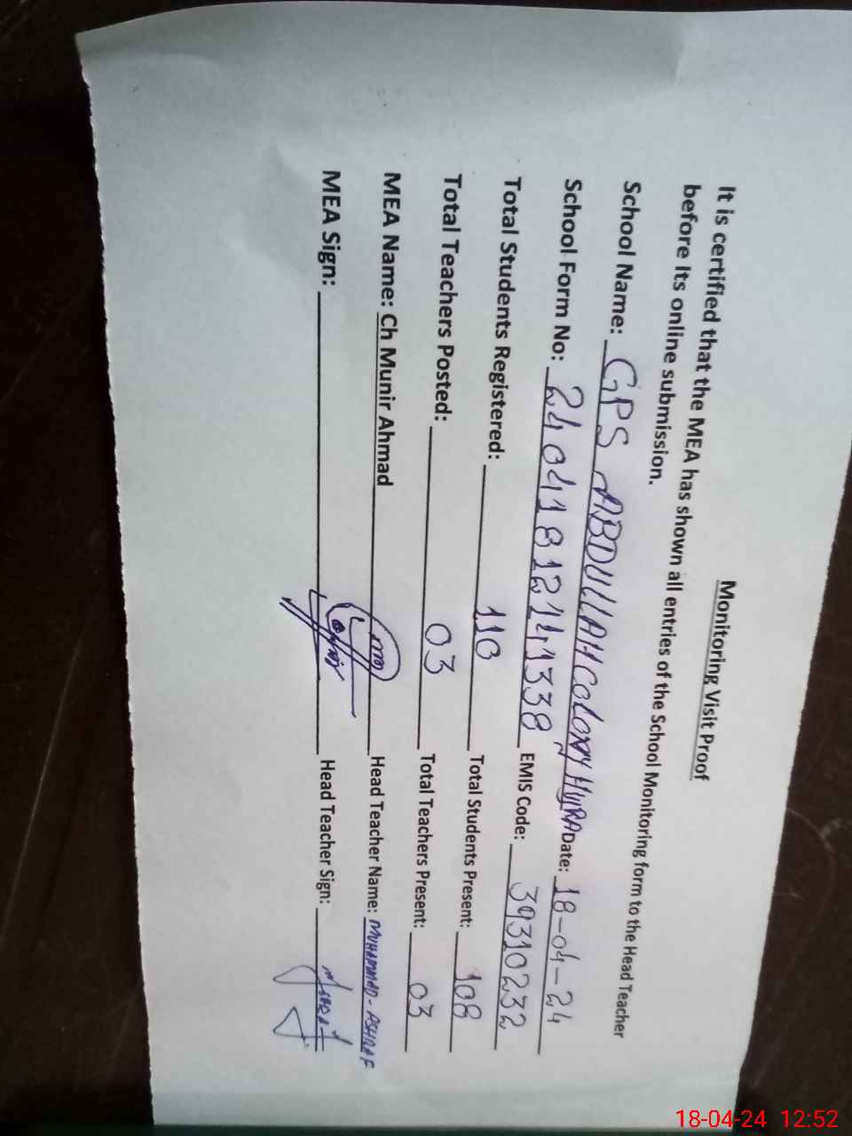 | EMIS Code: 39310232 | Name of School: GPS ABDULLAH COLONY | |||