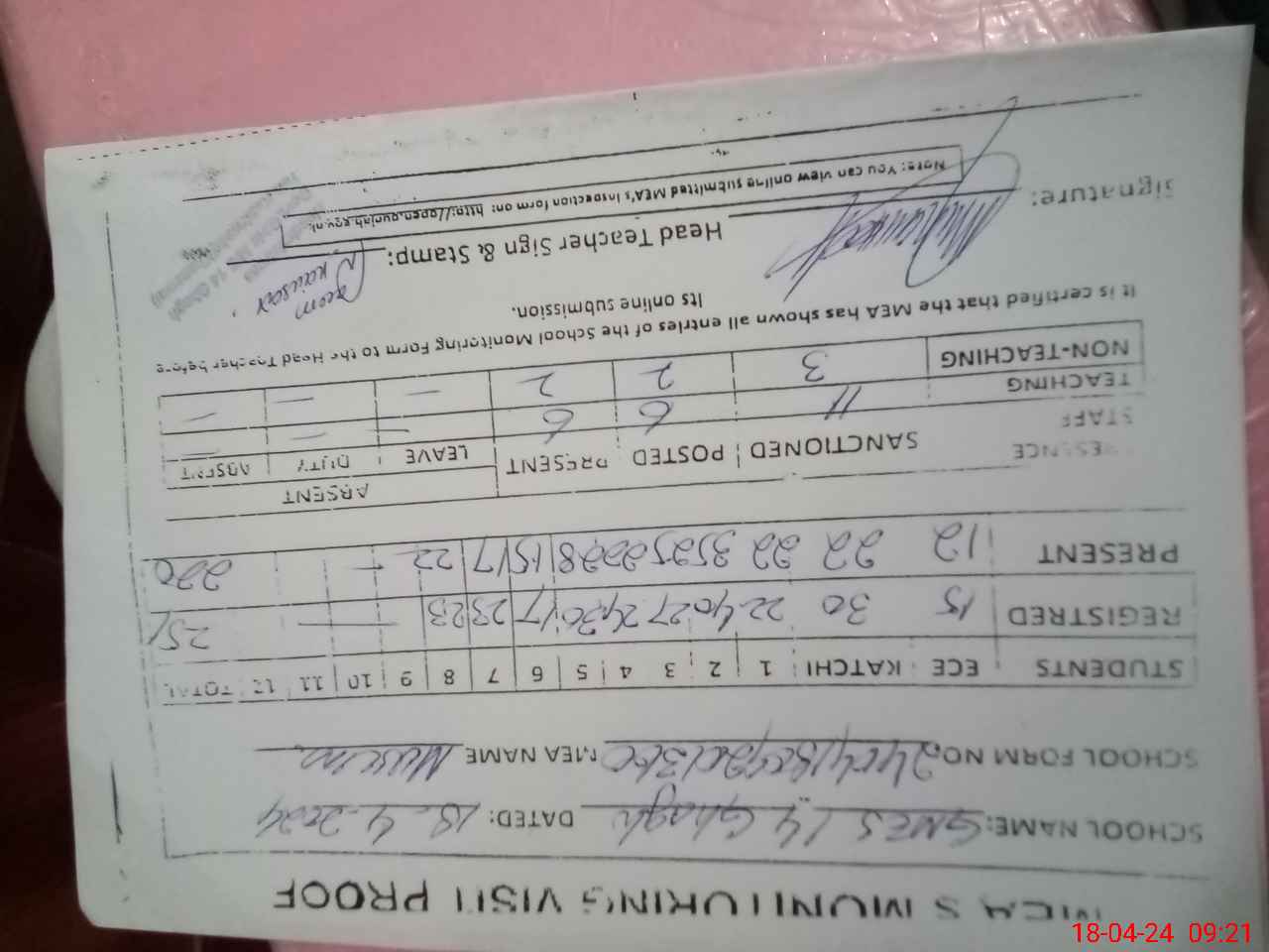 | Attendance Register | Head Teacher | MEA with School | Visit Proof |