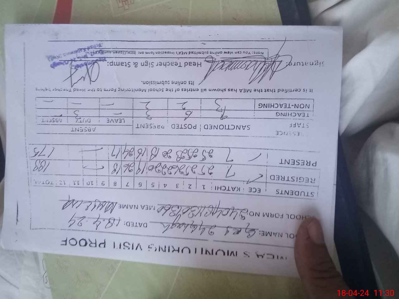 | Attendance Register | Head Teacher | MEA with School | Visit Proof |