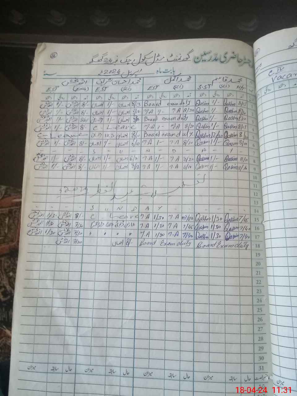 | 36**** | Mu**** Im**** Kh**** | 3 | 1 | 0 | 0 | 0 | 0 | 0 | 0 | 0 | 0 | 0 | Exam Duty |
