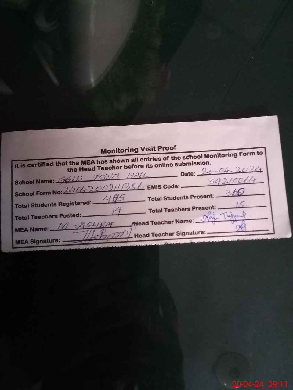 | Attendance Register | Head Teacher | MEA with School | Visit Proof |