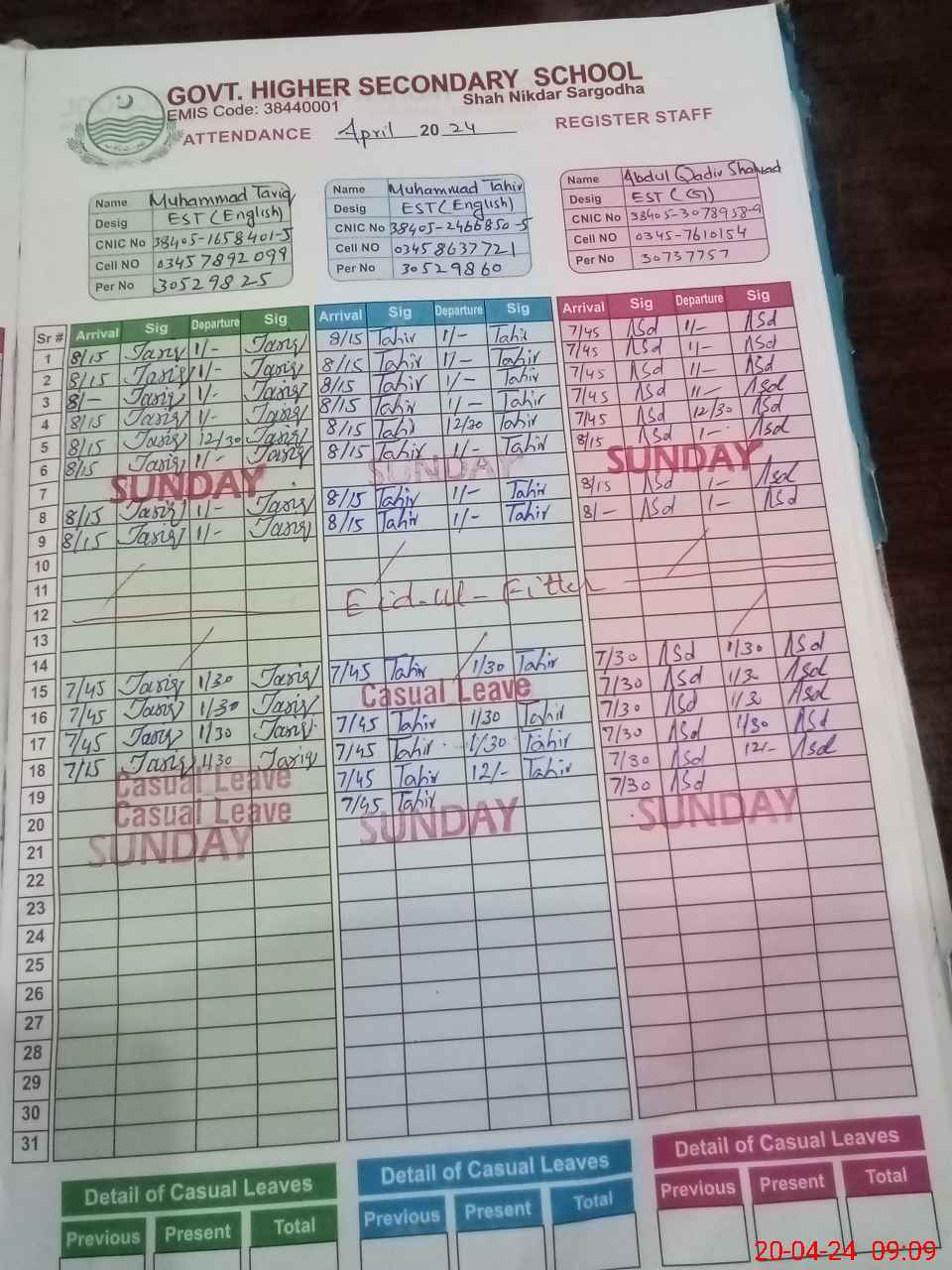 | CNIC | Full Name | Designation | R/C | Absence during last cal. month |