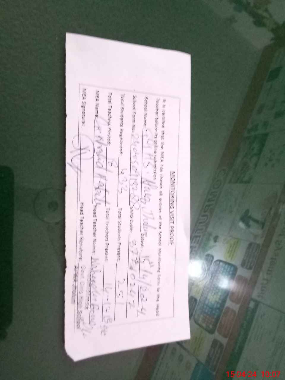 | Attendance Register | Head Teacher | MEA with School | Visit Proof |