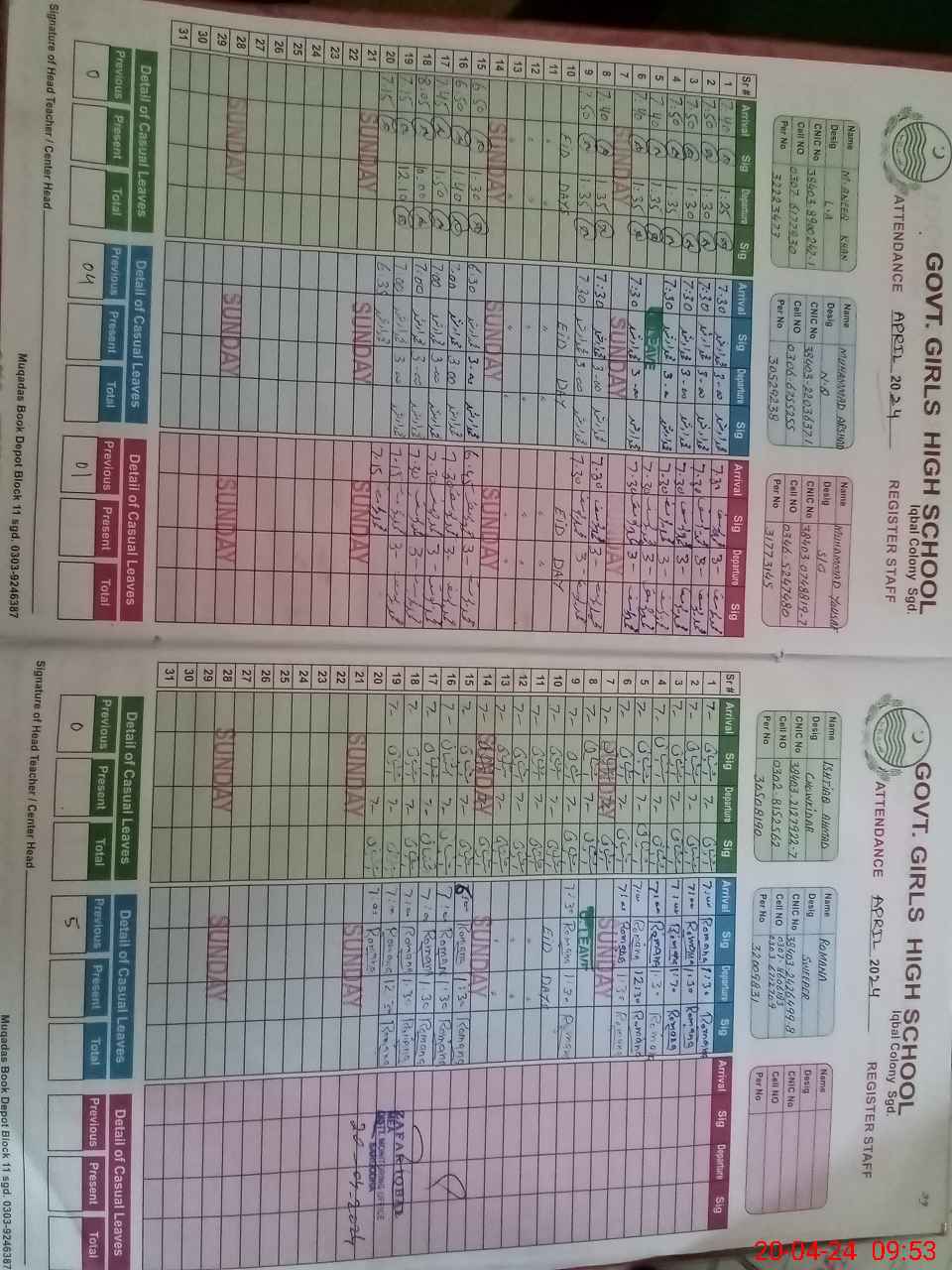 | CNIC | Full Name | Designation | R/C | Absence During Last Calender Month |