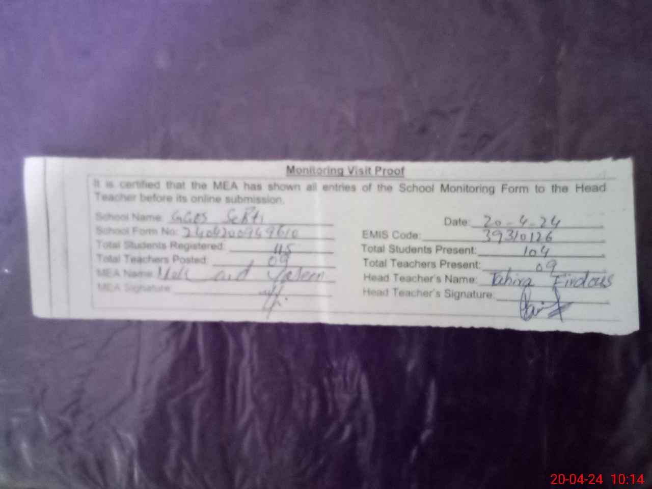 | Attendance Register | Head Teacher | MEA with School | Visit Proof |
