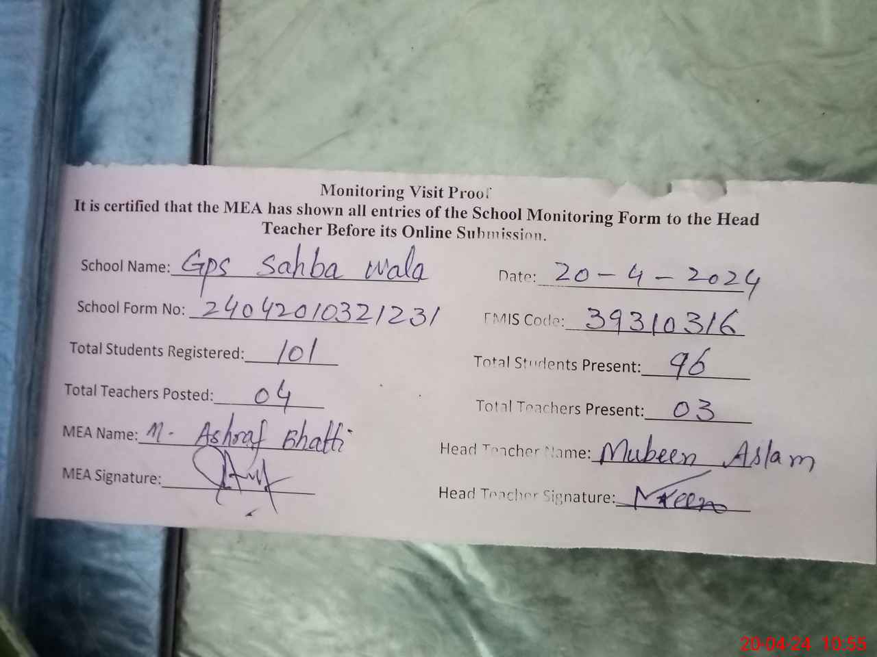 | Attendance Register | Head Teacher | MEA with School | Visit Proof |