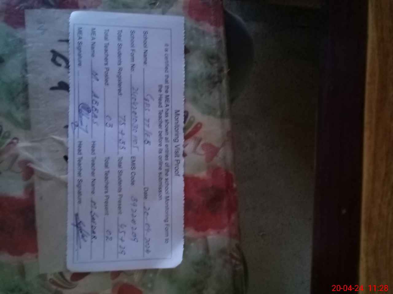| Attendance Register | Head Teacher | MEA with School | Visit Proof |