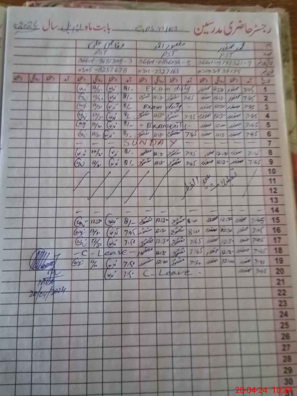 | CNIC | Full Name | Designation | R/C | Absence During Last Calender Month |