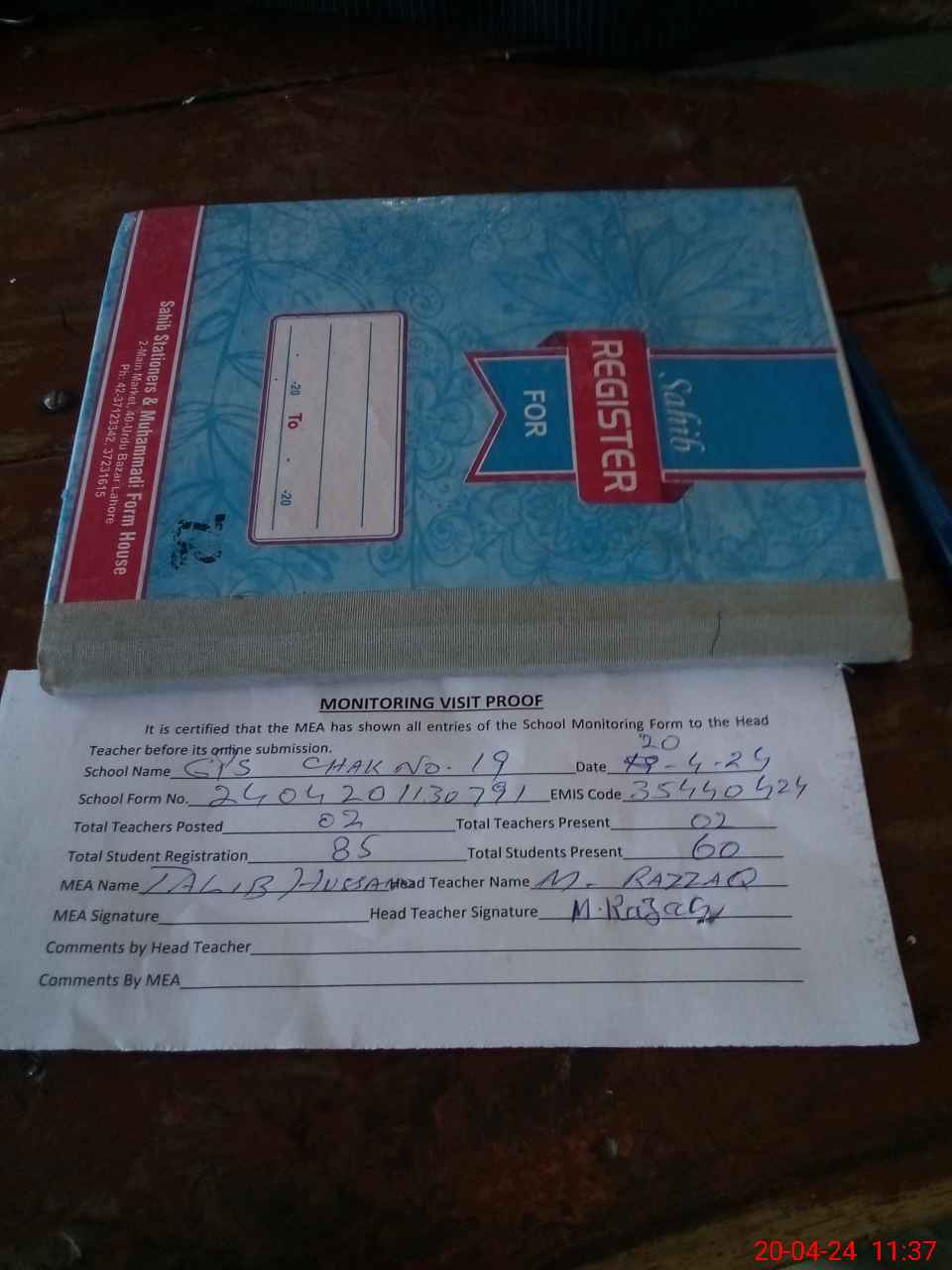 | Attendance Register | Head Teacher | MEA with School | Visit Proof |