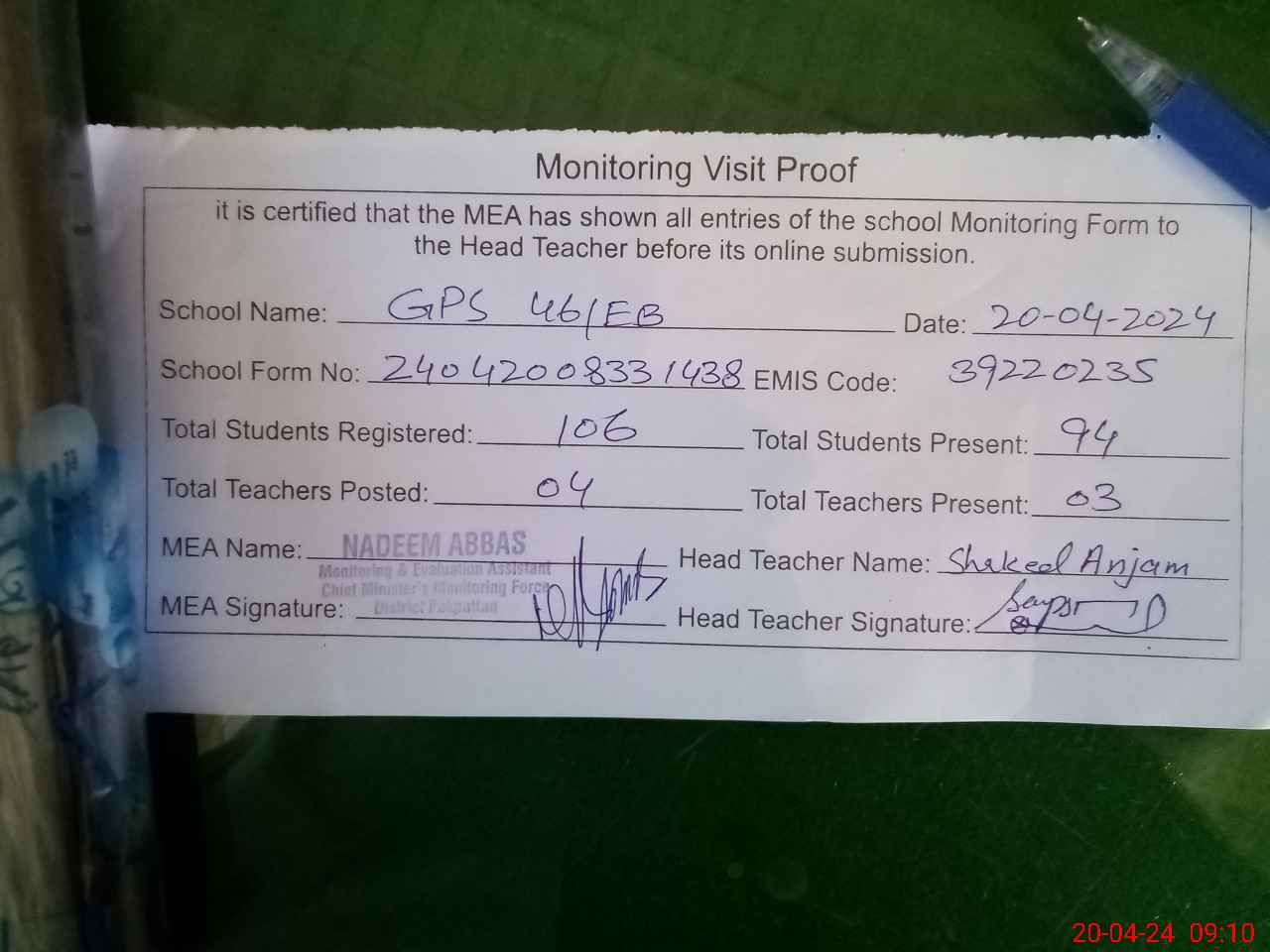 | Attendance Register | Head Teacher | MEA with School | Visit Proof |