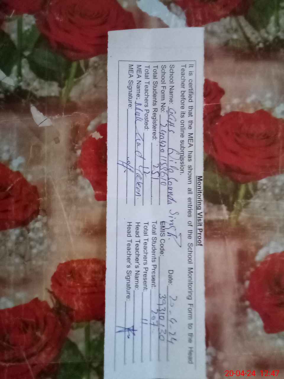 | Attendance Register | Head Teacher | MEA with School | Visit Proof |