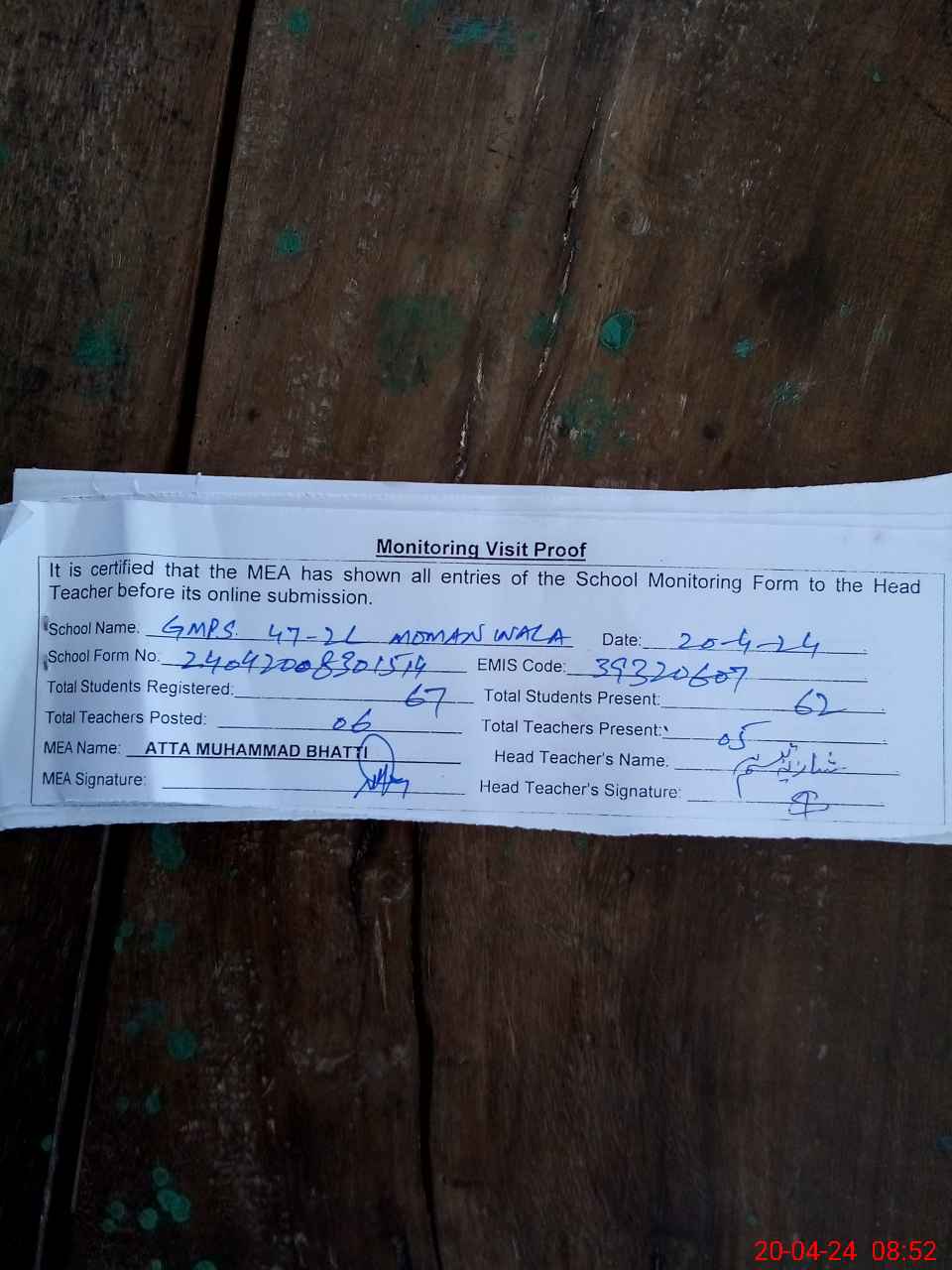 | EMIS Code: 39320607 | Name of School: GMPS 47/2-L MOMAN WALA | |||