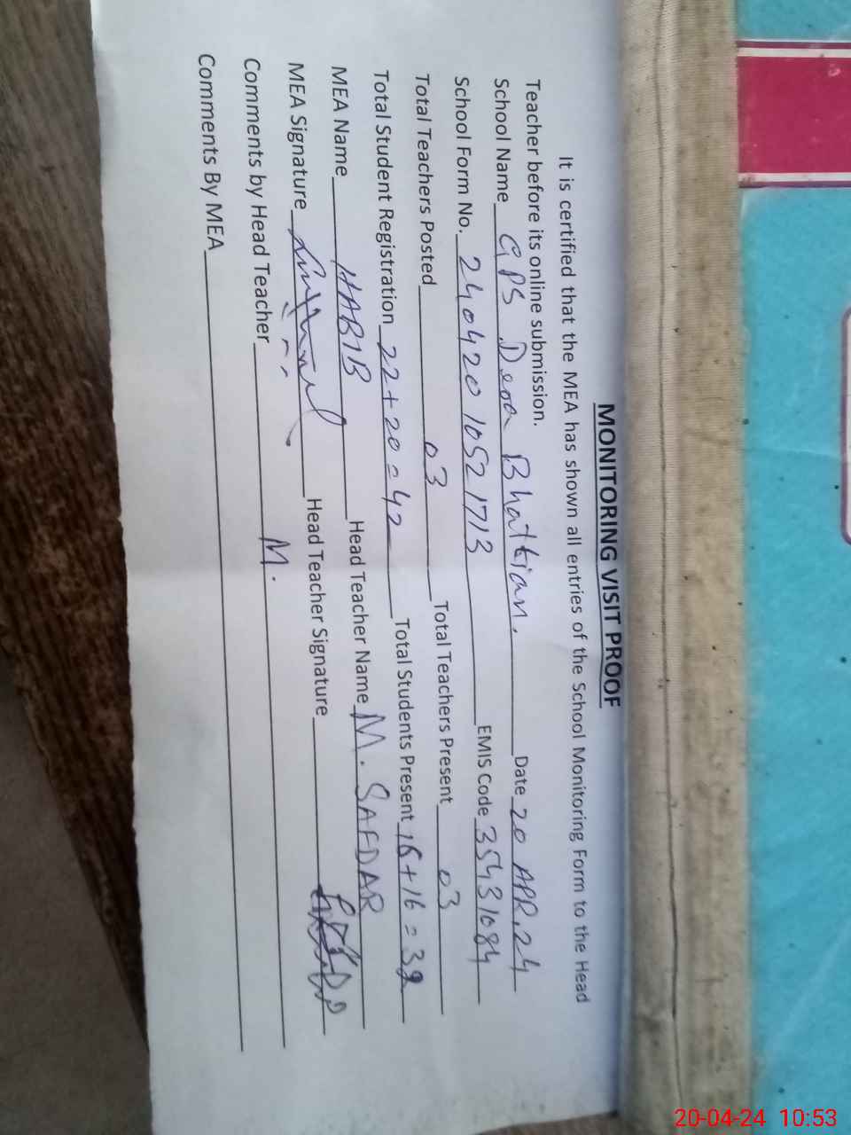 | EMIS Code: 35431084 | Name of School: GPS DERA BHATTIAN | |||