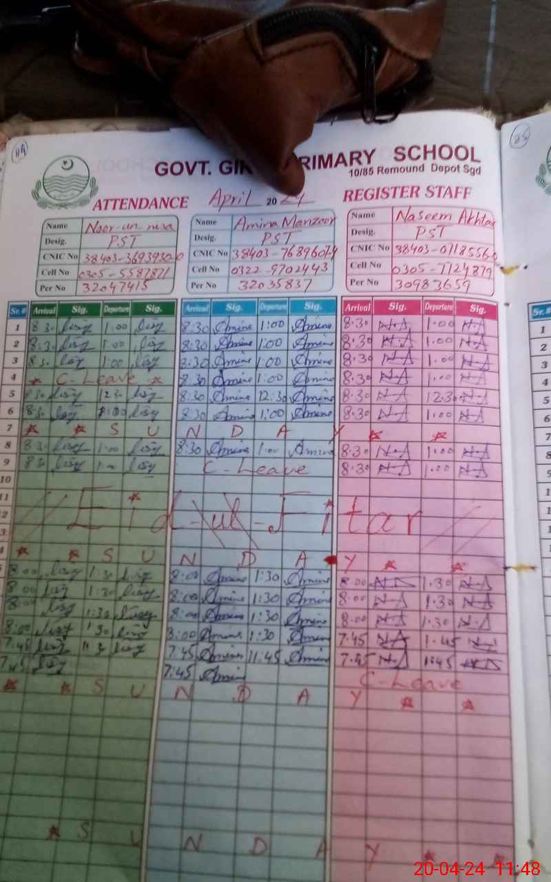 | CNIC | Full Name | Designation | R/C | Absence During Last Calender Month |