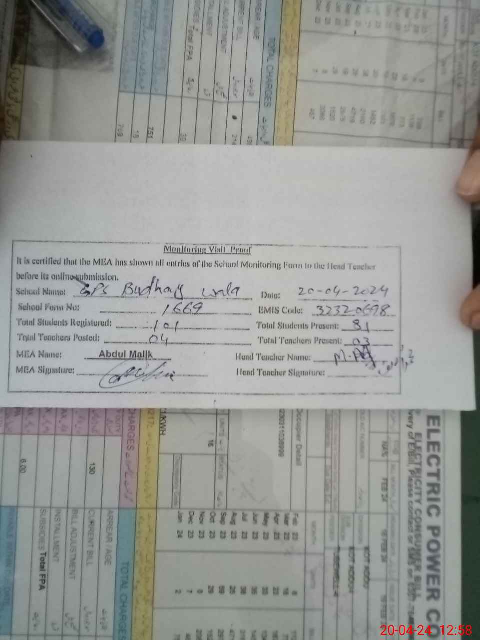 | Attendance Register | Head Teacher | MEA with School | Visit Proof |