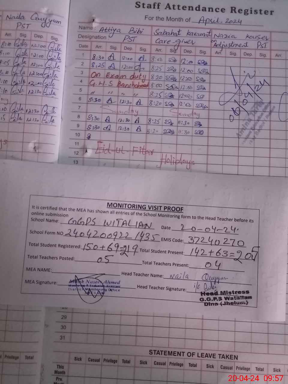 | Attendance Register | Head Teacher | MEA with School | Visit Proof |