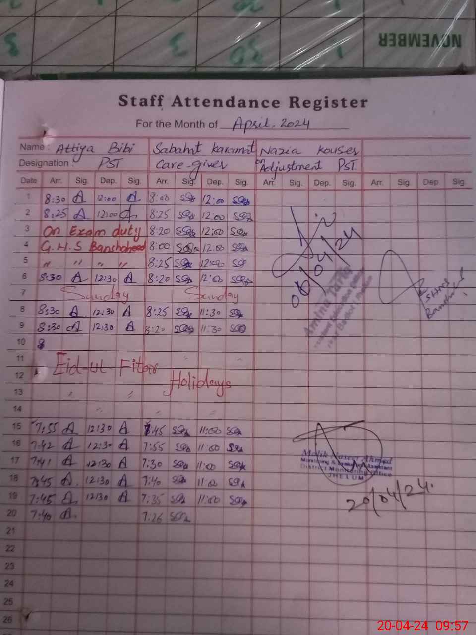 | Monitoring Date: 20-04-2024 | Start Time: 20-04-2024 09:22 AM | End Time: 20-04-2024 09:58 AM | Name of MEA: Na**** Ah**** | |