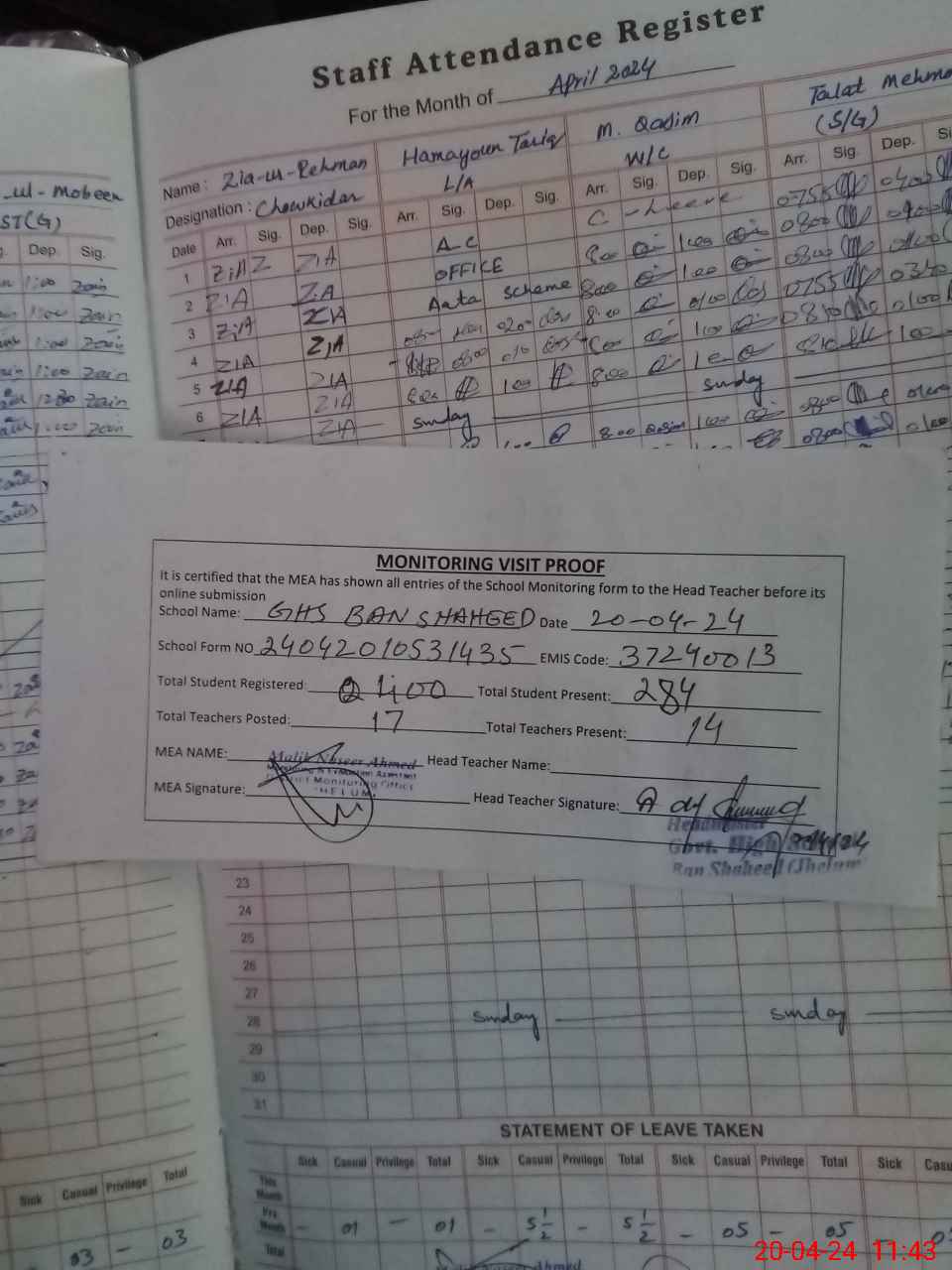 | Attendance Register | Head Teacher | MEA with School | Visit Proof |