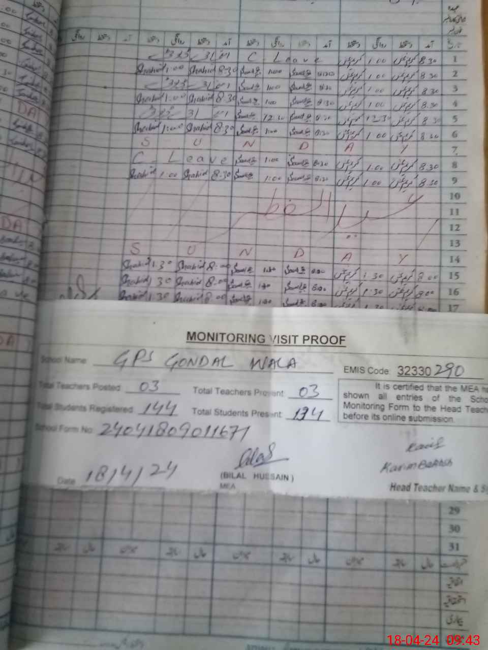 | Attendance Register | Head Teacher | MEA with School | Visit Proof |