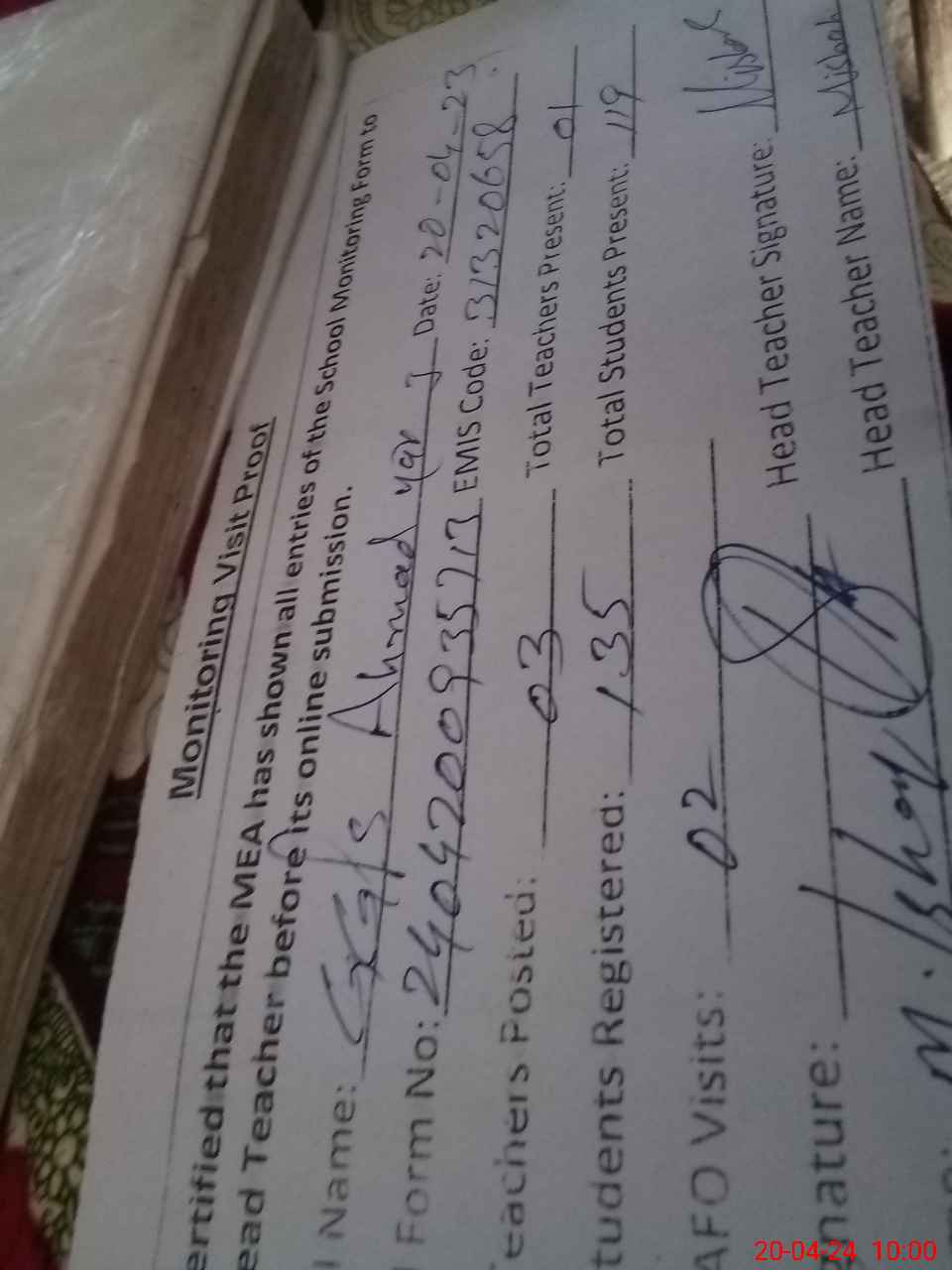 | Attendance Register | Head Teacher | MEA with School | Visit Proof |
