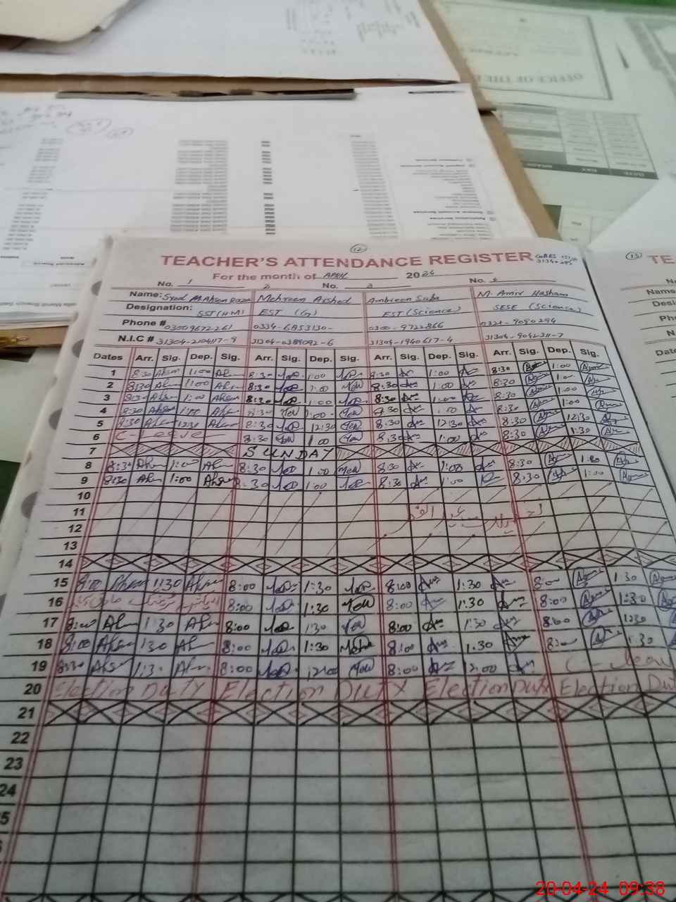 | CNIC | Full Name | Designation | R/C | Absence during last cal. month |