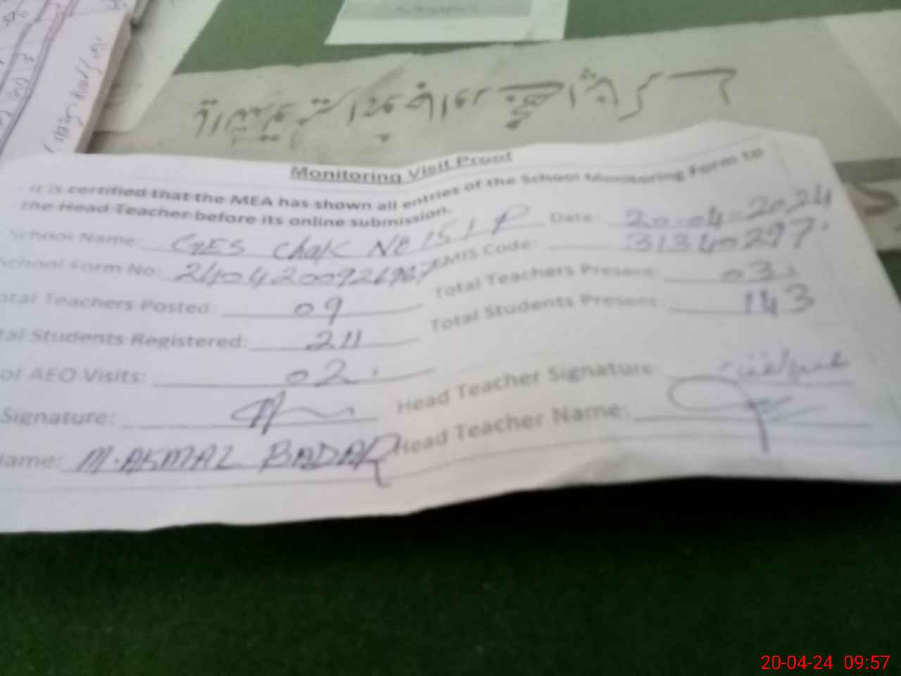 | Attendance Register | Head Teacher | MEA with School | Visit Proof |