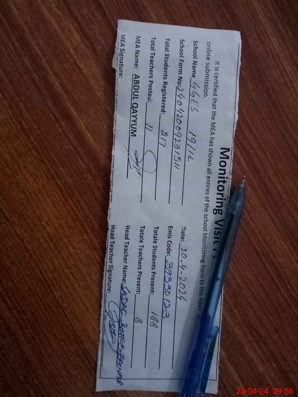 | Attendance Register | Head Teacher | MEA with School | Visit Proof |