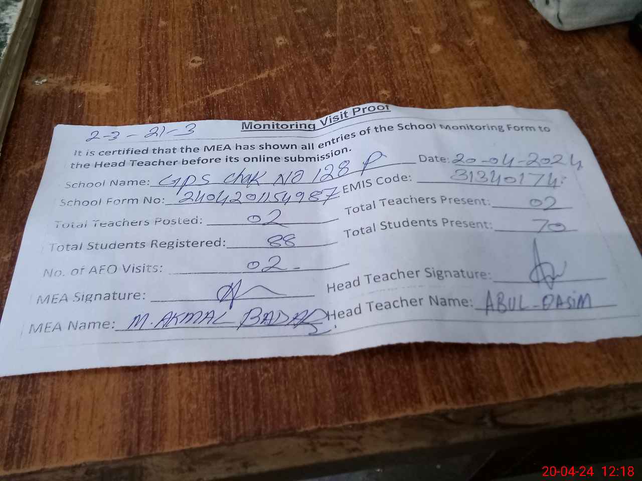 | Attendance Register | Head Teacher | MEA with School | Visit Proof |