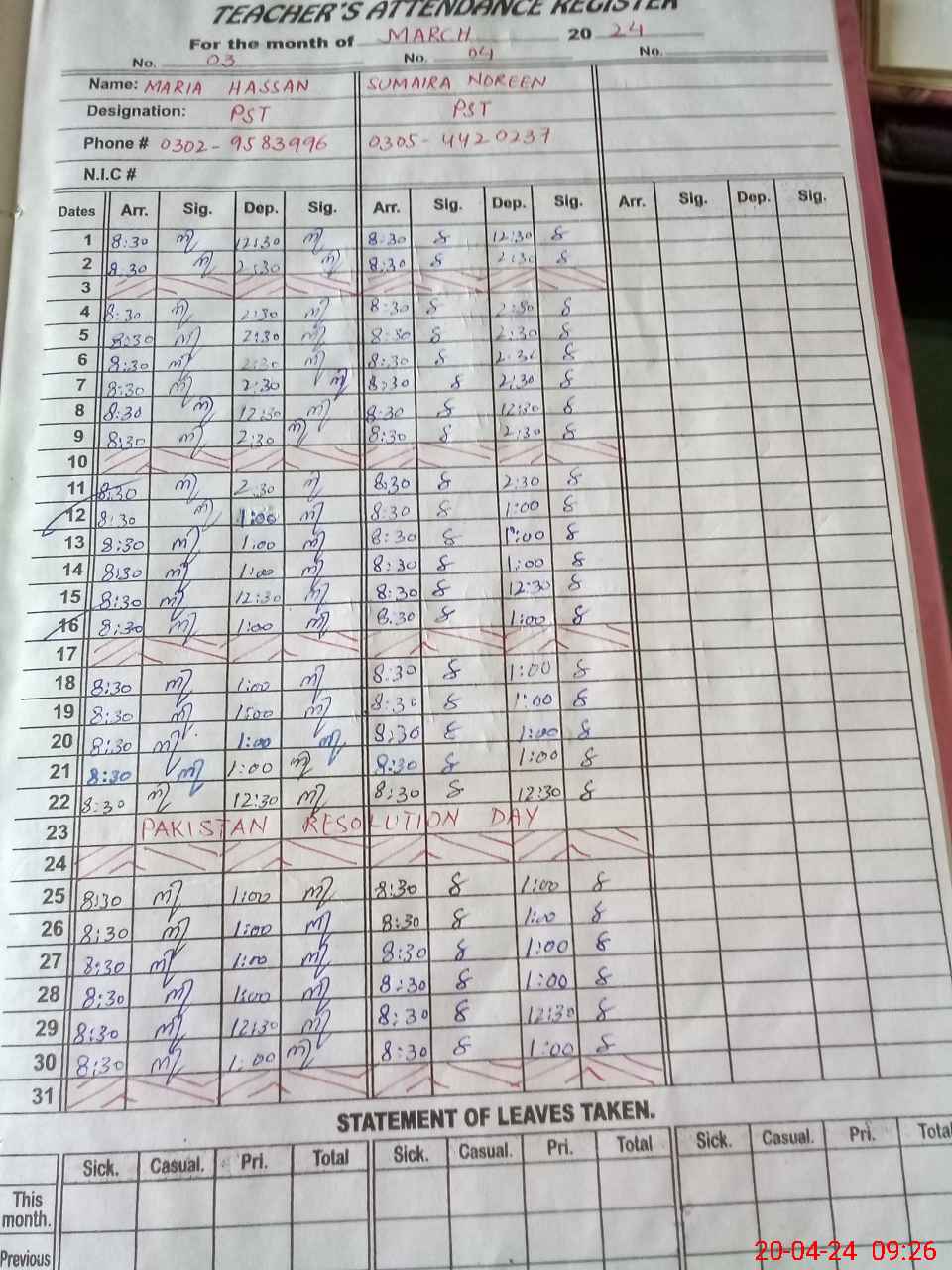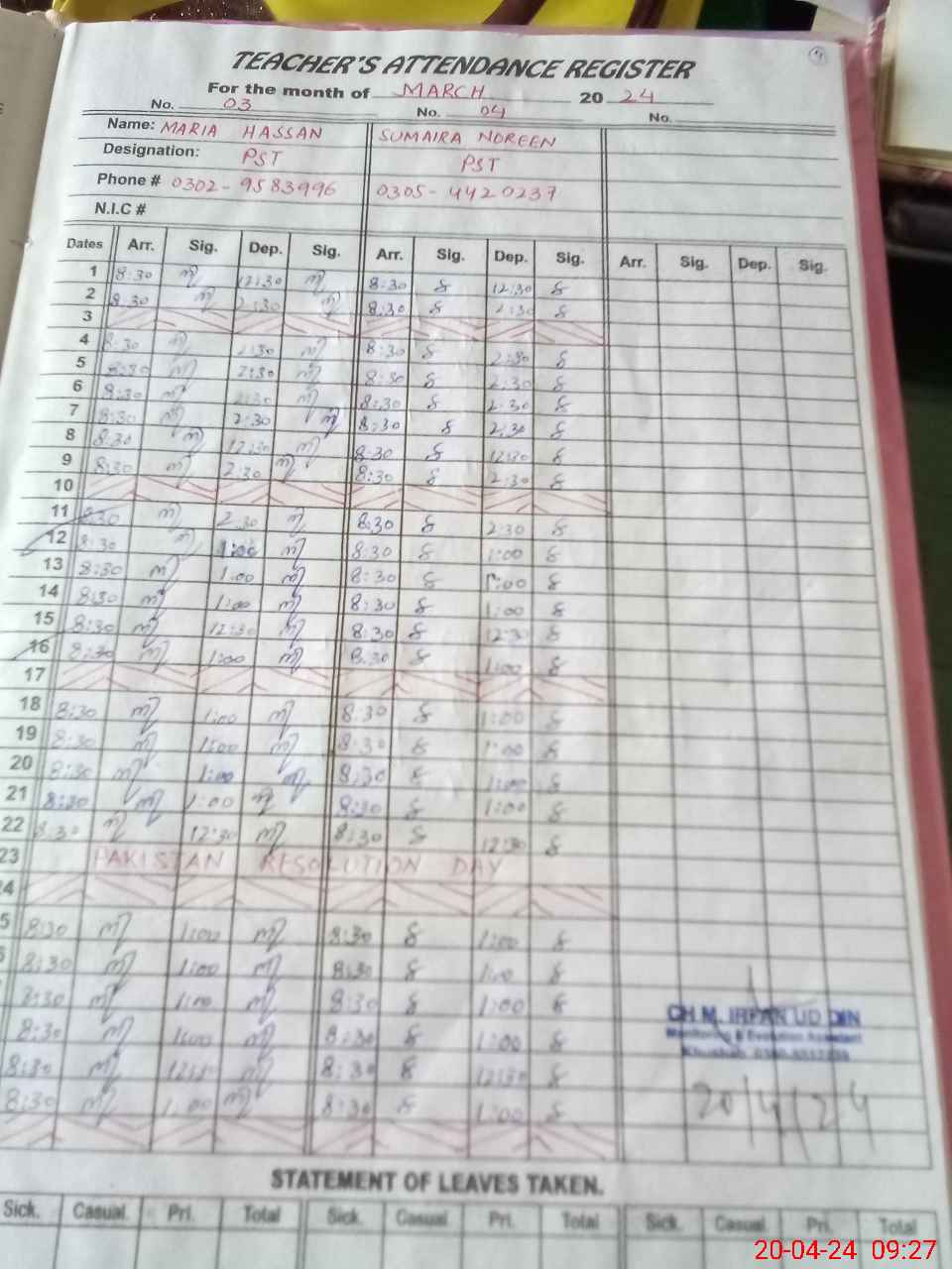 | Name: Ir**** Sh**** Designation: (School Headmaster's/Headmistress's) PST Phone/Cell Number: 03**** |