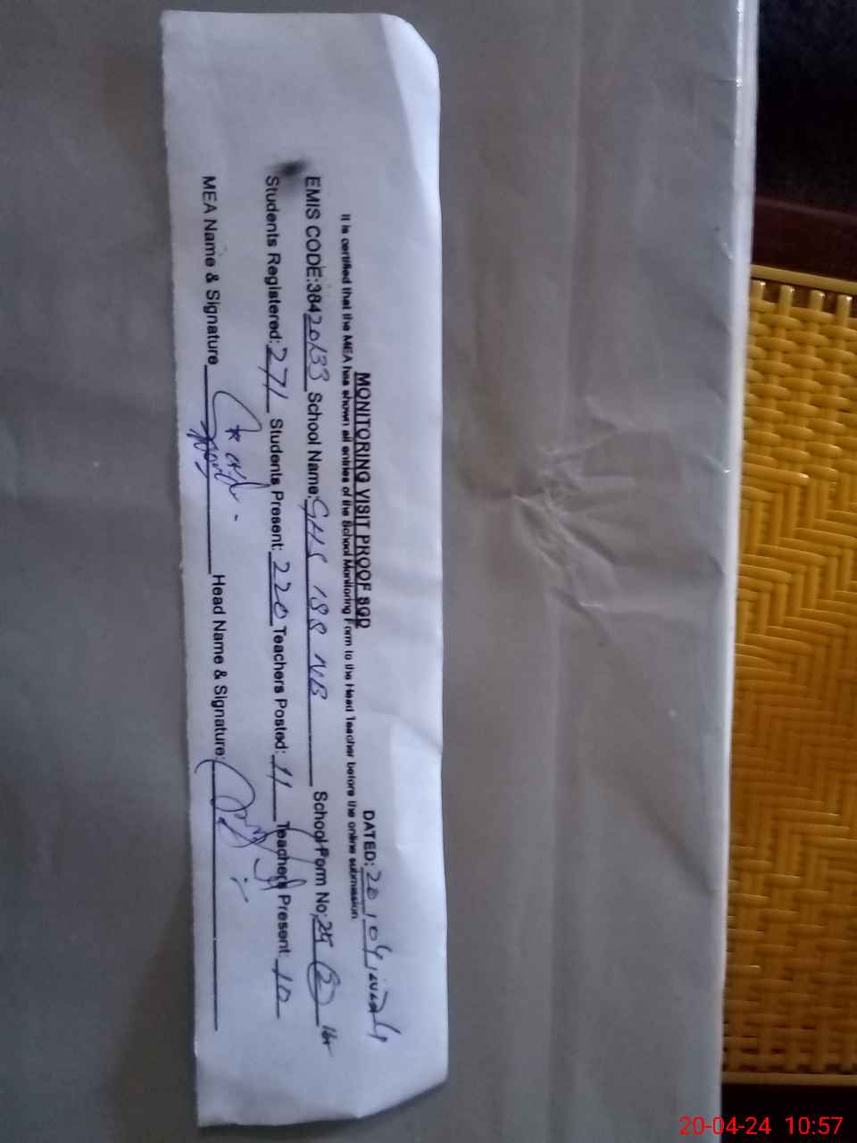 | Attendance Register | Head Teacher | MEA with School | Visit Proof |