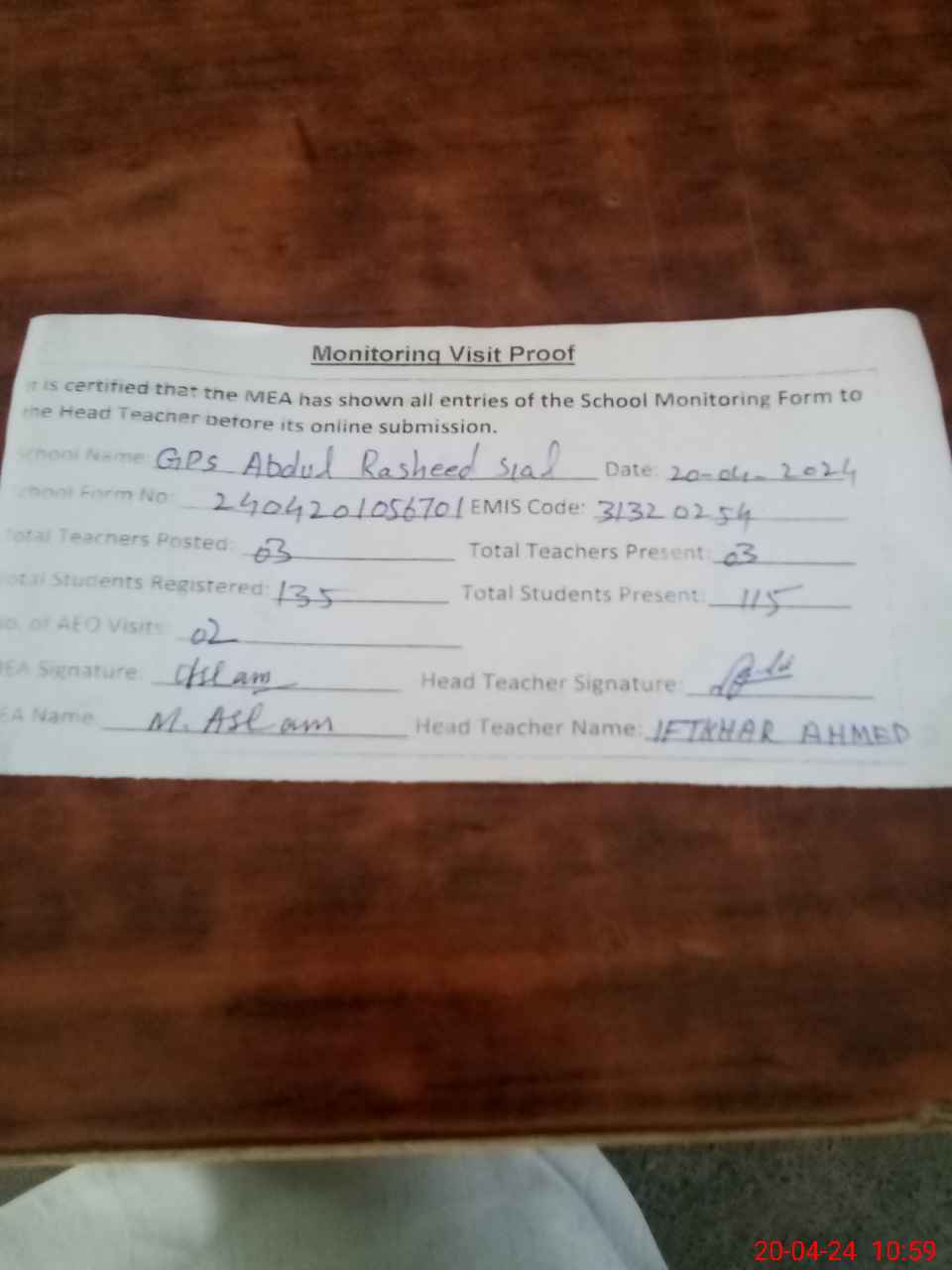 | Attendance Register | Head Teacher | MEA with School | Visit Proof |